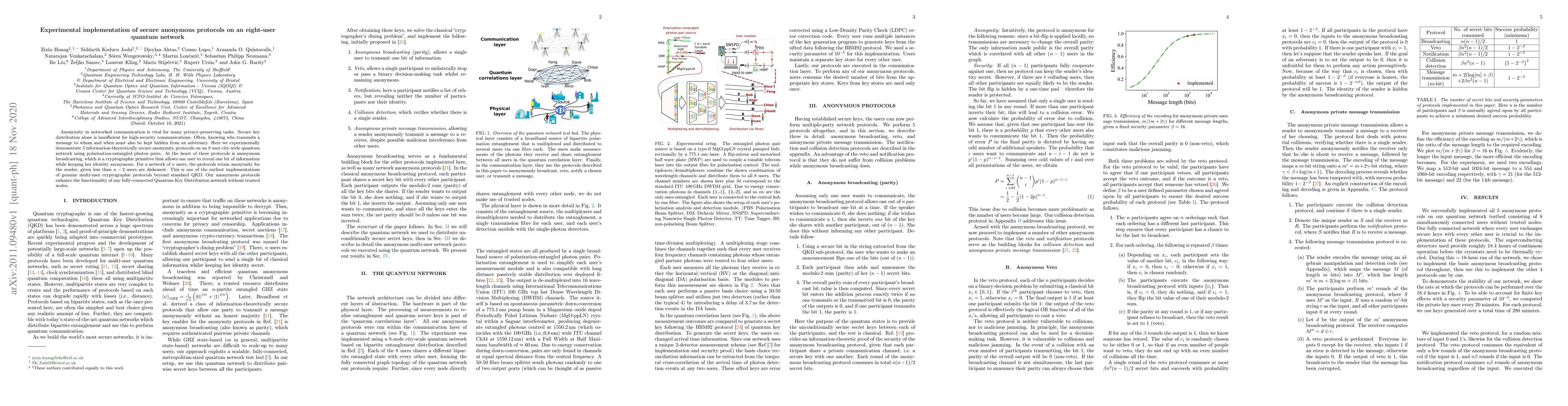 This paper demonstrates five information-theoretically secure anonymity protocols on an 8-user quantum network using entangled photon pairs, focusing on anonymous broadcasting to protect sender identity. The protocols maintain anonymity for the sender if fewer than $n-2$ users are dishonest, enhancing secure communications in fully-connected quantum networks.