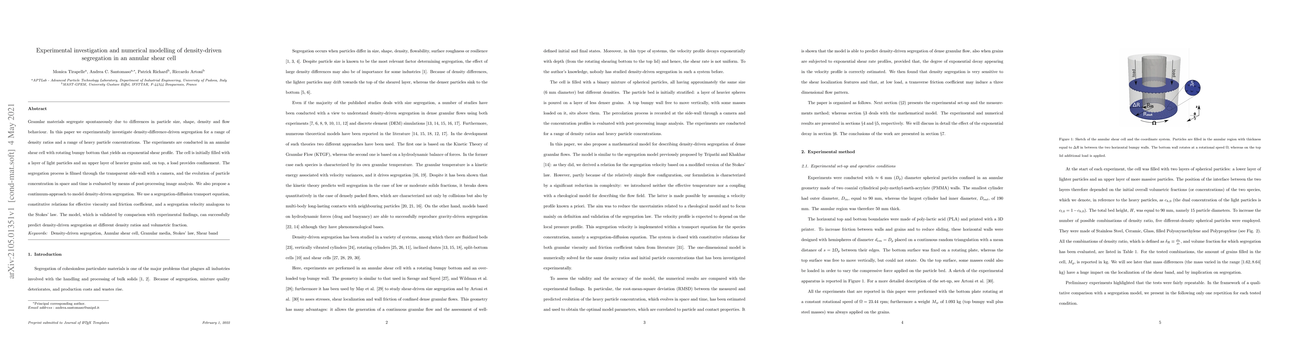 This paper experimentally studies how denser particles segregate from lighter ones in a rotating annular cell, using image analysis to track the process. A numerical model, validated against experiments, successfully predicts segregation at various density ratios and particle concentrations.