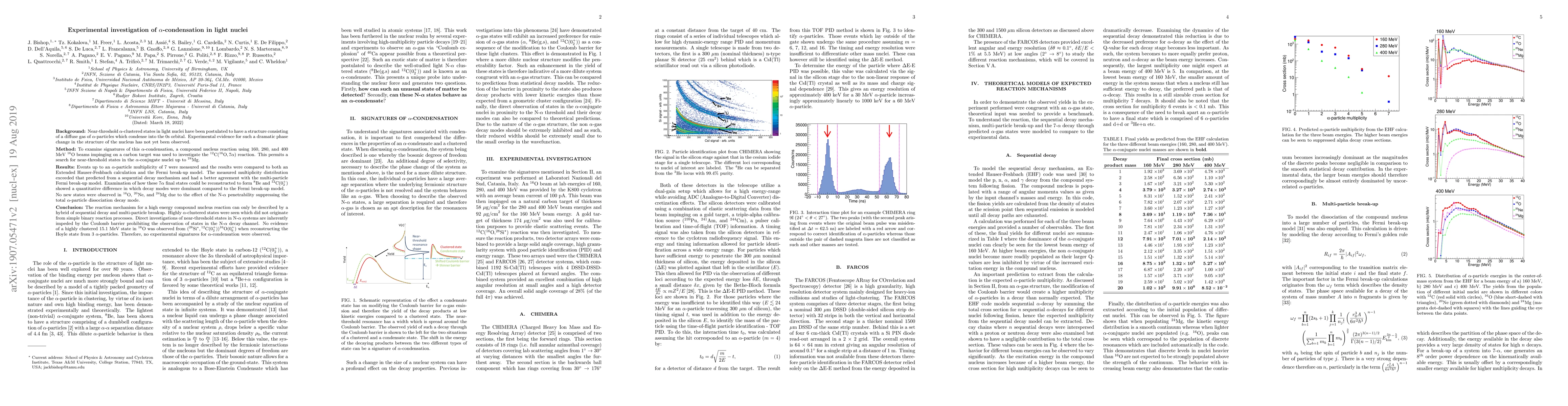 Method: To examine signatures of this alpha-condensation, a compound nucleus reaction using 160, 280, and 400 MeV 16O beams impinging on a carbon target was used to investigate the 12C(16O,7a) reaction. This permits a search for near-threshold states in the alpha-conjugate nuclei up to 24Mg. Results: Events up to an alpha-particle multiplicity of 7 were measured and the results were compared to both an Extended Hauser-Feshbach calculation and the Fermi break-up model. The measured multiplicity distribution exceeded that predicted from a sequential decay mechanism and had a better agreement with the multi-particle Fermi break-up model. Examination of how these 7 alpha final states could be reconstructed to form 8Be and 12C(0_2+) showed a quantitative difference in which decay modes were dominant compared to the Fermi break-up model. No new states were observed in 16O, 20Ne, and 24Mg due to the effect of the N-alpha penetrability suppressing the total alpha-particle dissociation decay mode. Conclusion: The reaction mechanism for a high energy compound nucleus reaction can only be described by a hybrid of sequential decay and multi-particle breakup. Highly alpha-clustered states were seen which did not originate from simple binary reaction processes. Direct investigations of near-threshold states in N-alpha systems are inherently impeded by the Coulomb barrier prohibiting the observation of states in the N-alpha decay channel. No evidence of a highly clustered 15.1 MeV state in 16O was observed from (28Si*,12C(0_2+))16O(0_6+) when reconstructing the Hoyle state from 3 alpha-particles. Therefore, no experimental signatures for alpha-condensation were observed.