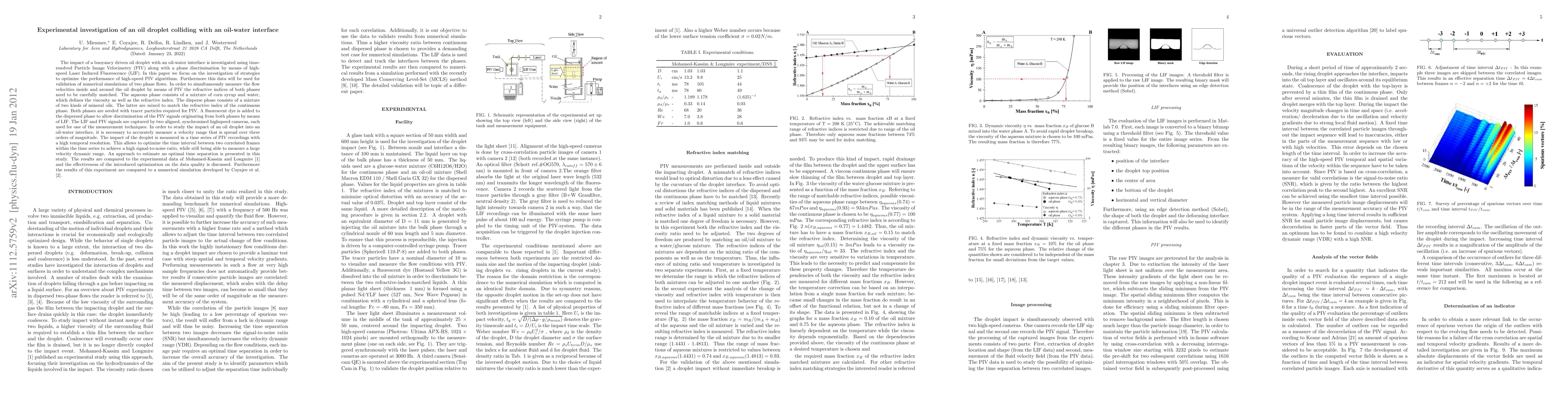 This paper investigates the impact of a buoyancy-driven oil droplet on an oil-water interface using high-speed PIV and LIF, focusing on optimizing PIV algorithms for velocity measurement. The study also validates numerical simulations of two-phase flows and discusses the effectiveness of the introduced optimization techniques.