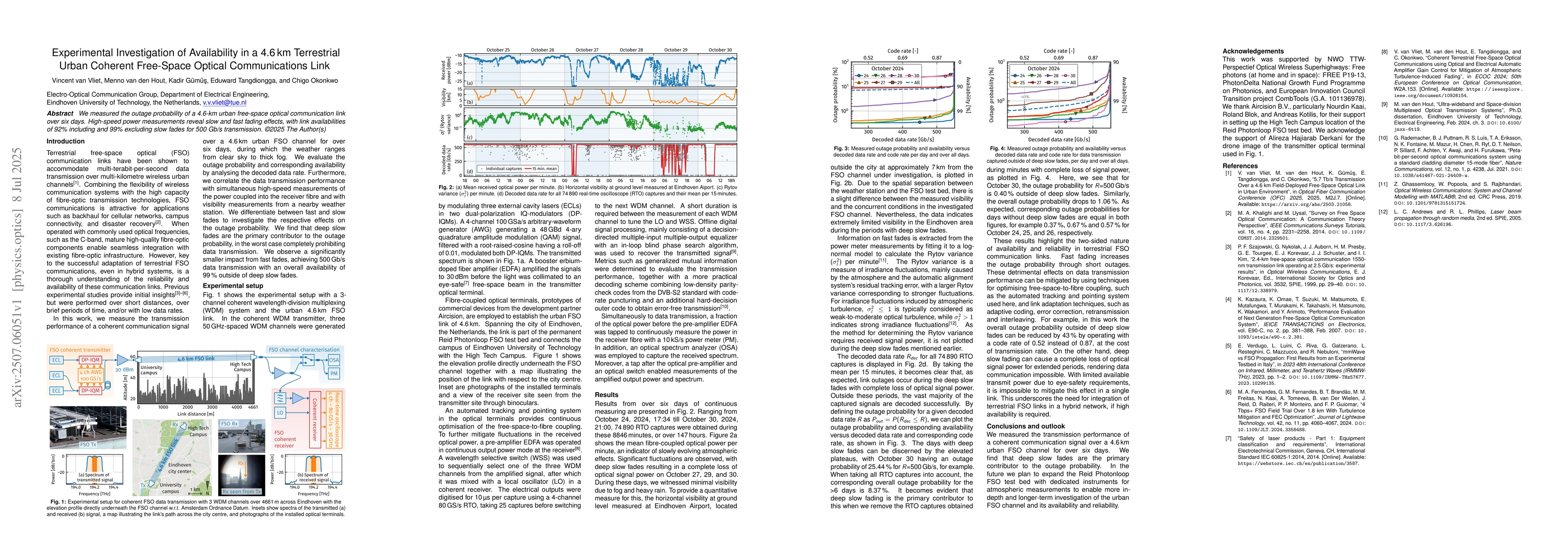 We measured the outage probability of a 4.6-km urban free-space optical communication link over six days. High-speed power measurements reveal slow and fast fading effects, with link availabilities of 92% including and 99% excluding slow fades for 500 Gb/s transmission.