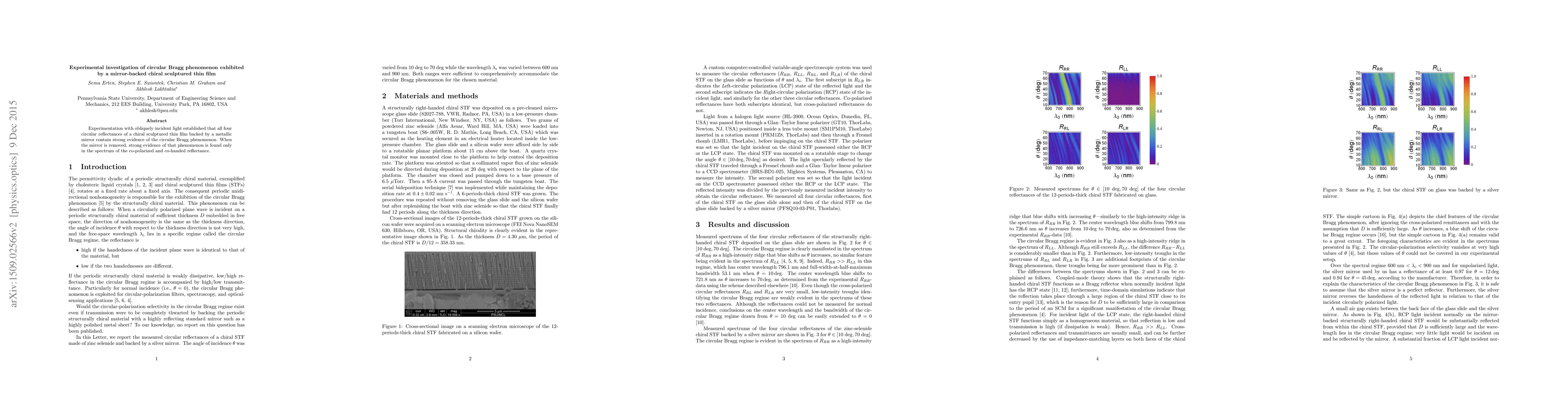 Experimentation with obliquely incident light established that all four circular reflectances of a chiral sculptured thin film backed by a metallic mirror contain strong evidence of the circular Bragg phenomenon. When the mirror is removed, strong evidence of that phenomenon is found only in the spectrum of the co-polarized and co-handed reflectance.