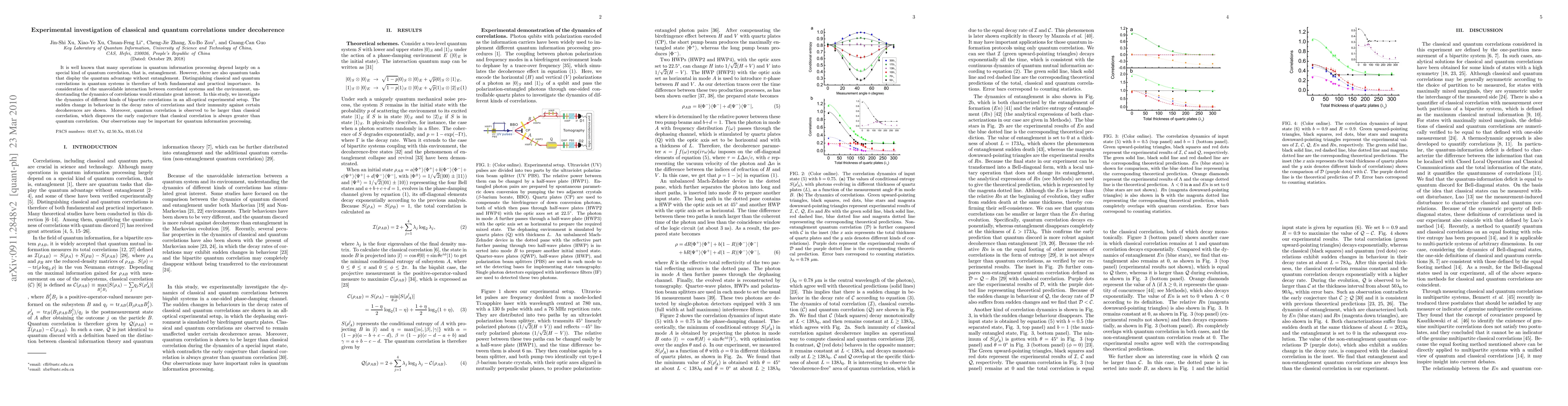 Researchers investigated the dynamics of classical and quantum correlations in a controlled experiment, finding that quantum correlations decay faster but remain more robust against decoherence than classical correlations.