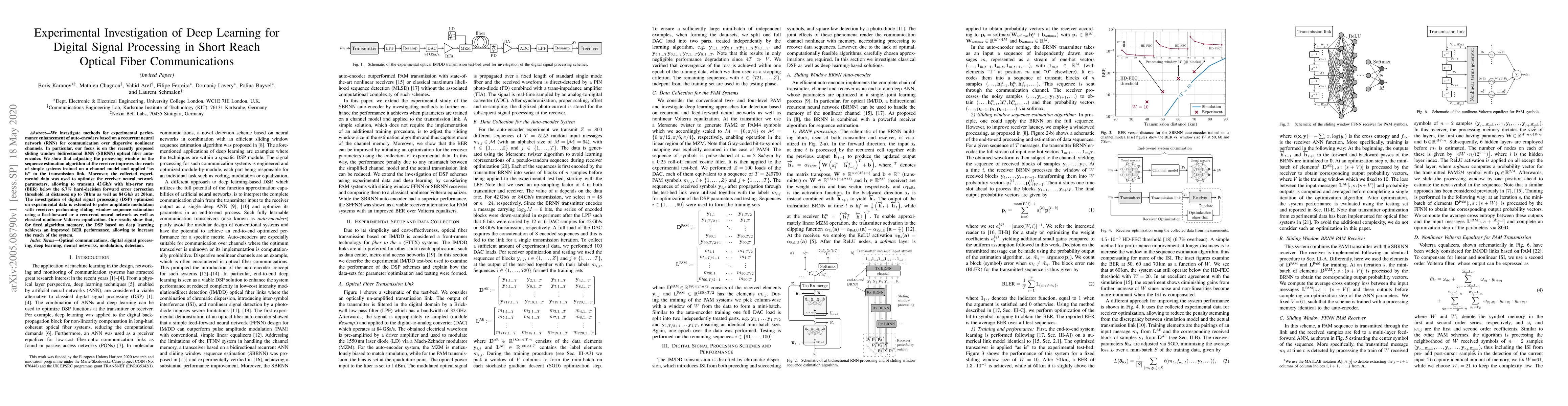 This paper explores the use of deep learning, specifically sliding window bidirectional RNNs, to enhance digital signal processing in short reach optical fiber communications. Experimental results show improved transmission performance, achieving 42 Gb/s at 70 km and 84 Gb/s at 20 km, with optimized neural network parameters.