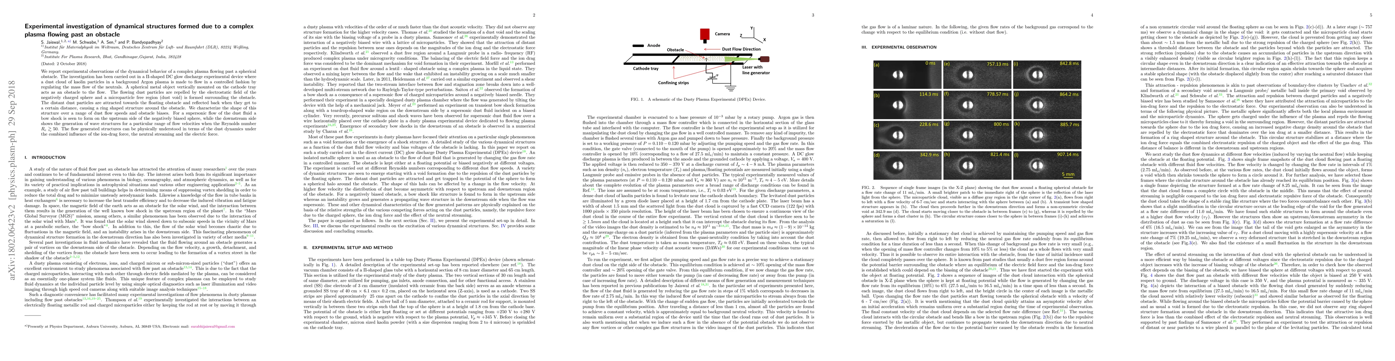 This paper investigates the dynamical structures formed by flowing complex plasma past a spherical obstacle, using kaolin particles in an Argon plasma. The experiment reveals the formation of a dust void and a ring-shaped structure around the obstacle, with a bow shock and wave structures observed under specific flow conditions.