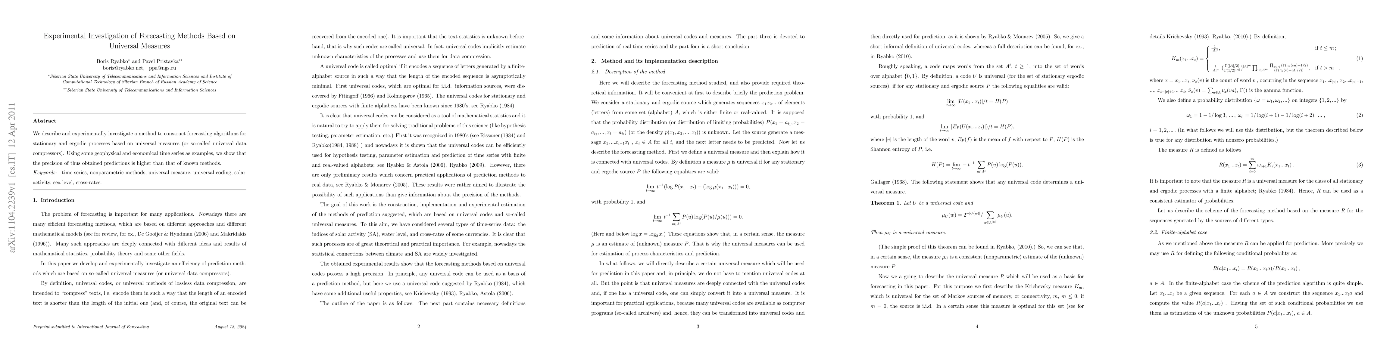 We describe and experimentally investigate a method to construct forecasting algorithms for stationary and ergodic processes based on universal measures (or so-called universal data compressors). Using some geophysical and economical time series as examples, we show that the precision of thus obtained predictions is higher than that of known methods.