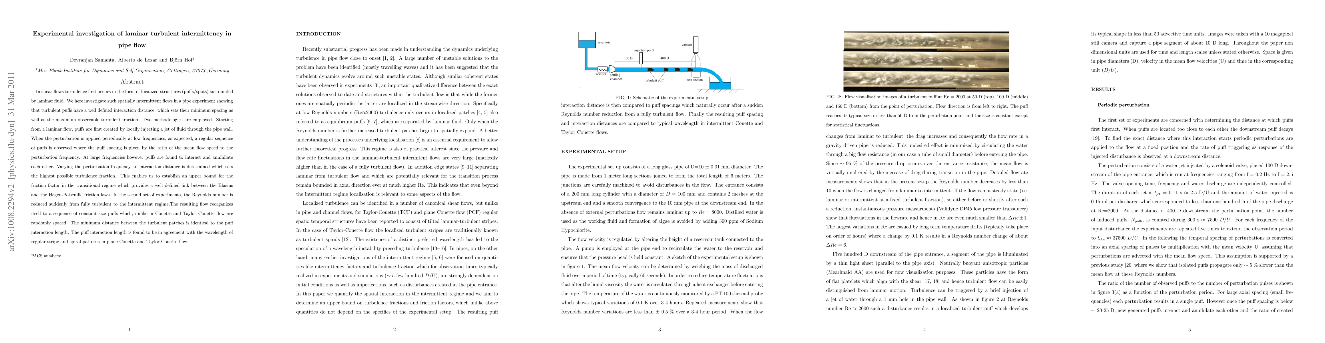 This paper investigates laminar-turbulent intermittency in pipe flow, demonstrating that turbulent puffs have a defined interaction distance that sets the minimum spacing and maximum turbulent fraction. Experiments show that puffs can be created by injecting fluid and their interaction distance is consistent with patterns in plane Couette and Taylor-Couette flows, suggesting a common interaction mechanism.