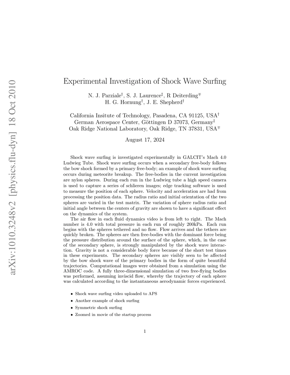 Shock wave surfing is investigated experimentally in GALCIT's Mach 4.0 Ludwieg Tube. Shock wave surfing occurs when a secondary free-body follows the bow shock formed by a primary free-body; an example of shock wave surfing occurs during meteorite breakup. The free-bodies in the current investigation are nylon spheres. During each run in the Ludwieg tube a high speed camera is used to capture a series of schlieren images; edge tracking software is used to measure the position of each sphere. Velocity and acceleration are had from processing the position data. The radius ratio and initial orientation of the two spheres are varied in the test matrix. The variation of sphere radius ratio and initial angle between the centers of gravity are shown to have a significant effect on the dynamics of the system. The air flow in each fluid dynamics video is from left to right. The Mach number is 4.0 with total pressure in each run of roughly 200kPa. Each run begins with the spheres tethered and no flow. Flow arrives and the tethers are quickly broken. The spheres are then free-bodies with the dominant force being the pressure distribution around the surface of the sphere, which, in the case of the secondary sphere, is strongly manipulated by the shock wave interaction. Gravity is not a considerable body force because of the short test times in these experiments. The secondary spheres are visibly seen to be affected by the bow shock wave of the primary bodies in the form of quite beautiful trajectories. Computational images were obtained from a simulation using the AMROC code. A fully three-dimensional simulation of two free-flying bodies was performed, assuming inviscid flow, whereby the trajectory of each sphere was calculated according to the instantaneous aerodynamic forces experienced.