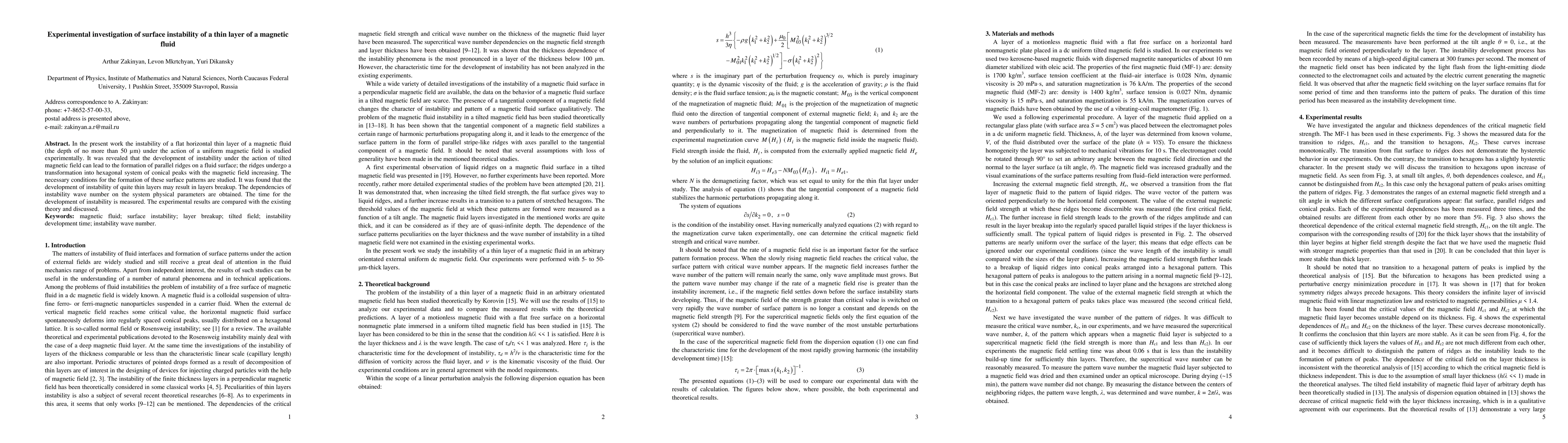 In the present work the instability of a flat horizontal thin layer of a magnetic fluid (the depth of no more than 50 \mum) under the action of a uniform magnetic field is studied experimentally. It was revealed that the development of instability under the action of tilted magnetic field can lead to the formation of parallel ridges on a fluid surface; the ridges undergo a transformation into hexagonal system of conical peaks with the magnetic field increasing. The necessary conditions for the formation of these surface patterns are studied. It was found that the development of instability of quite thin layers may result in layers breakup. The dependencies of instability wave number on the system physical parameters are obtained. The time for the development of instability is measured. The experimental results are compared with the existing theory and discussed.