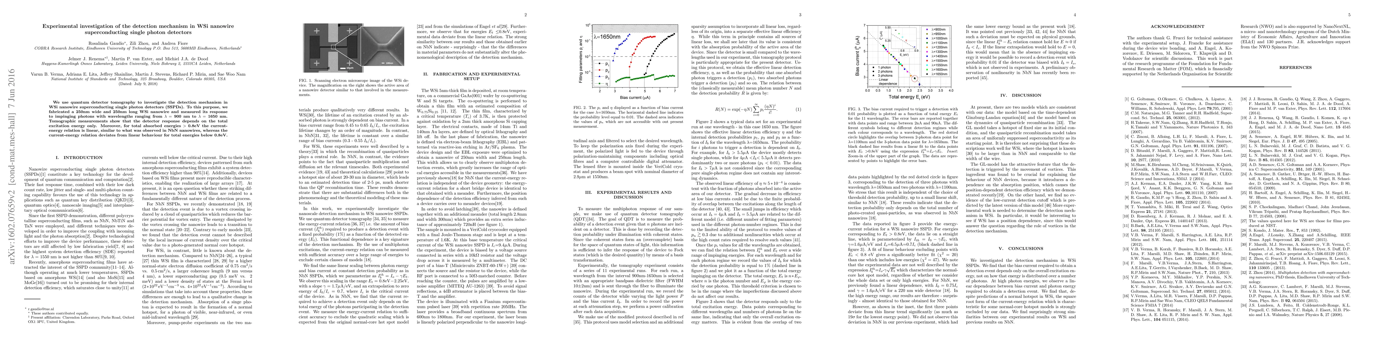 This paper investigates the detection mechanism in WSi nanowire superconducting single photon detectors (SSPDs) using quantum detector tomography. The study reveals that the detector's response depends on the total excitation energy, with a linear current-energy relation for energies above 0.8 eV, similar to NbN nanowires.
