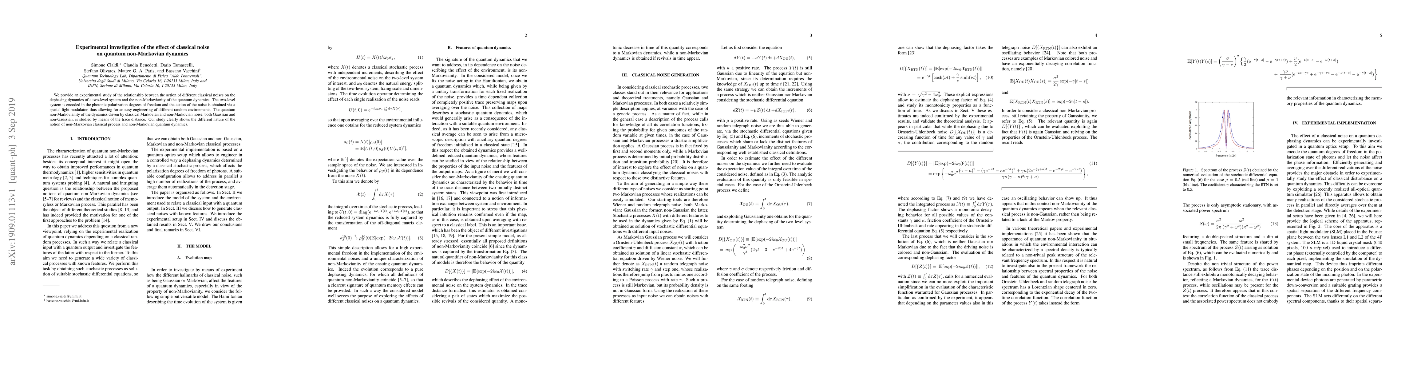 We provide an experimental study of the relationship between the action of different classical noises on the dephasing dynamics of a two-level system and the non-Markovianity of the quantum dynamics. The two-level system is encoded in the photonic polarization degrees of freedom and the action of the noise is obtained via a spatial light modulator, thus allowing for an easy engineering of different random environments. The quantum non-Markovianity of the dynamics driven by classical Markovian and non-Markovian noise, both Gaussian and non-Gaussian, is studied by means of the trace distance. Our study clearly shows the different nature of the notion of non-Markovian classical process and non-Markovian quantum dynamics.