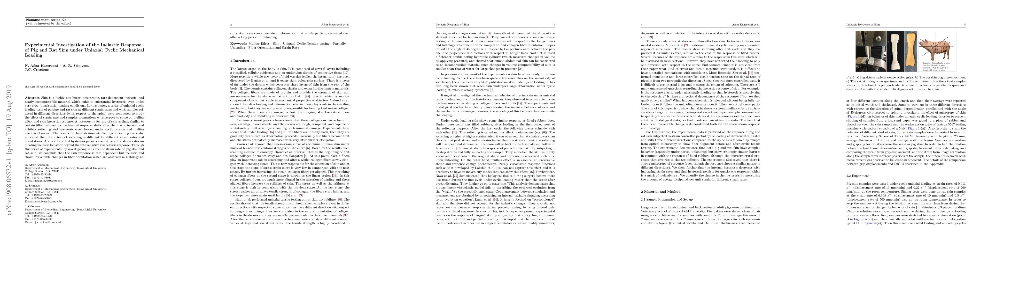 This study investigates the inelastic response of pig and rat skin under uniaxial cyclic mechanical loading, revealing that the skin's mechanical response is rate-dependent and shows irreversible changes in fiber orientation. The experiments show persistent hysteresis and deformation even at low strain rates, indicating significant inelastic behavior.