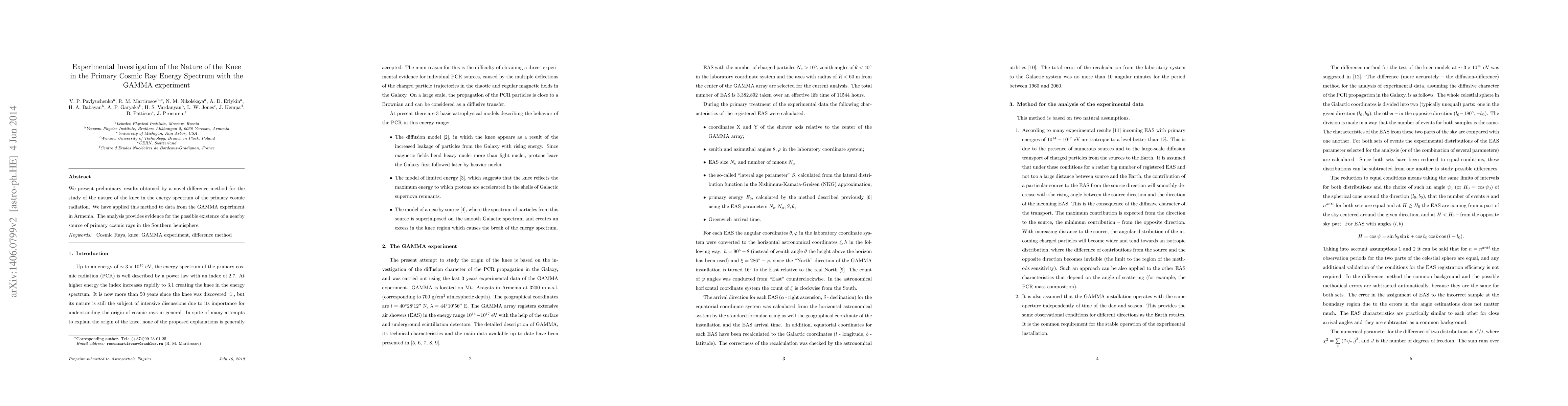 Summary: This paper reports preliminary findings from the GAMMA experiment in Armenia using a novel difference method to investigate the "knee" in the primary cosmic ray energy spectrum, suggesting a potential nearby source in the Southern hemisphere.