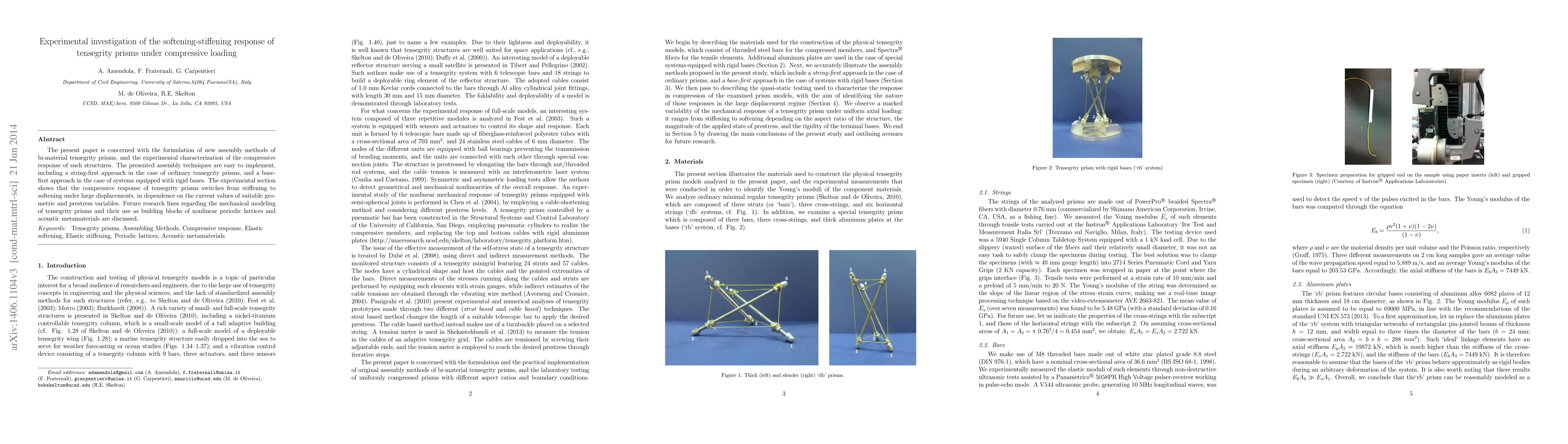 This paper investigates new assembly methods for bi-material tensegrity prisms and experimentally characterizes their compressive response, revealing a transition from stiffening to softening under large displacements. Future work will explore mechanical modeling and potential applications in nonlinear lattices and acoustic metamaterials.