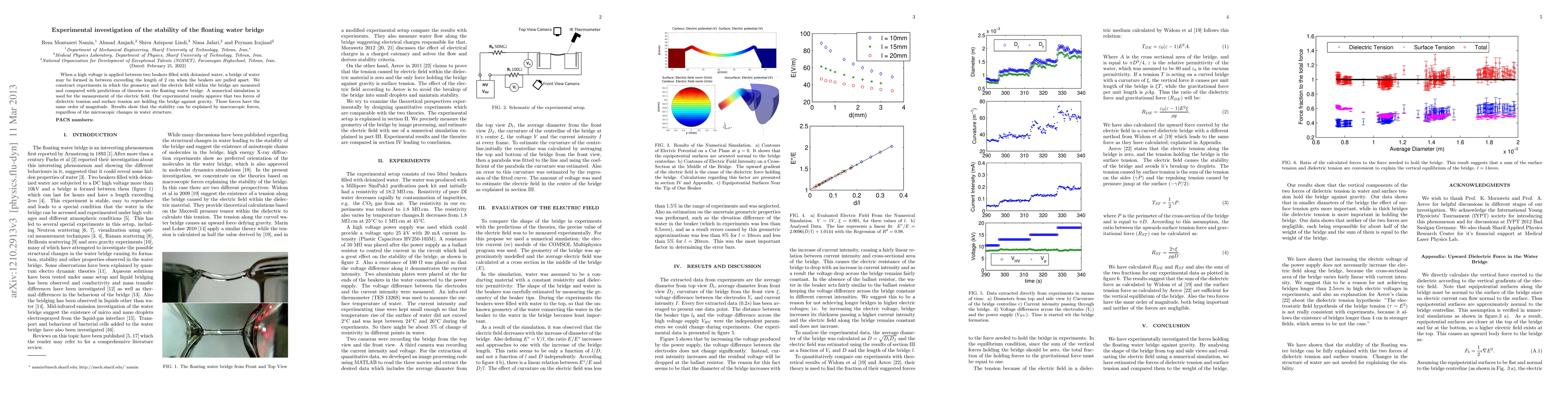 This paper investigates the stability of a floating water bridge formed by high voltage between two beakers, confirming that dielectric and surface tensions maintain its integrity against gravity. Experimental and numerical simulations support the theoretical predictions of macroscopic forces governing the bridge's stability.