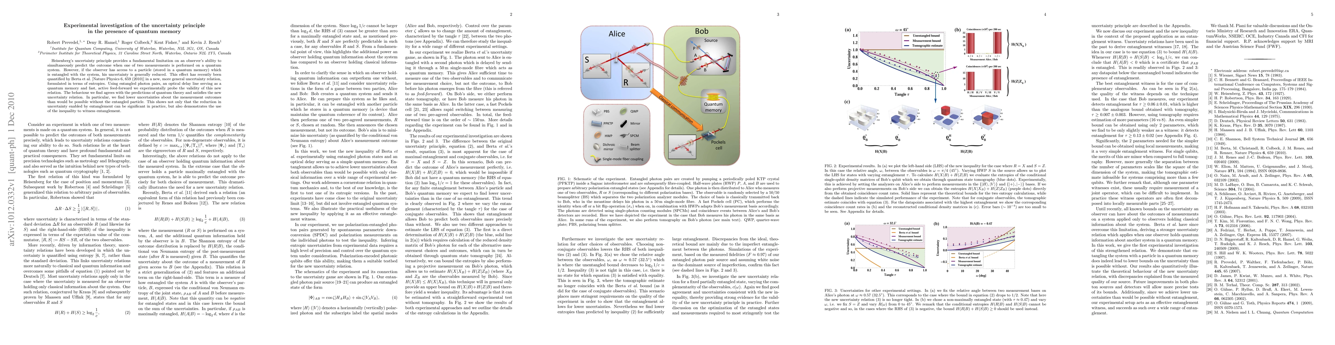Heisenberg's uncertainty principle provides a fundamental limitation on an observer's ability to simultaneously predict the outcome when one of two measurements is performed on a quantum system. However, if the observer has access to a particle (stored in a quantum memory) which is entangled with the system, his uncertainty is generally reduced. This effect has recently been quantified by Berta et al. [Nature Physics 6, 659 (2010)] in a new, more general uncertainty relation, formulated in terms of entropies. Using entangled photon pairs, an optical delay line serving as a quantum memory and fast, active feed-forward we experimentally probe the validity of this new relation. The behaviour we find agrees with the predictions of quantum theory and satisfies the new uncertainty relation. In particular, we find lower uncertainties about the measurement outcomes than would be possible without the entangled particle. This shows not only that the reduction in uncertainty enabled by entanglement can be significant in practice, but also demonstrates the use of the inequality to witness entanglement.