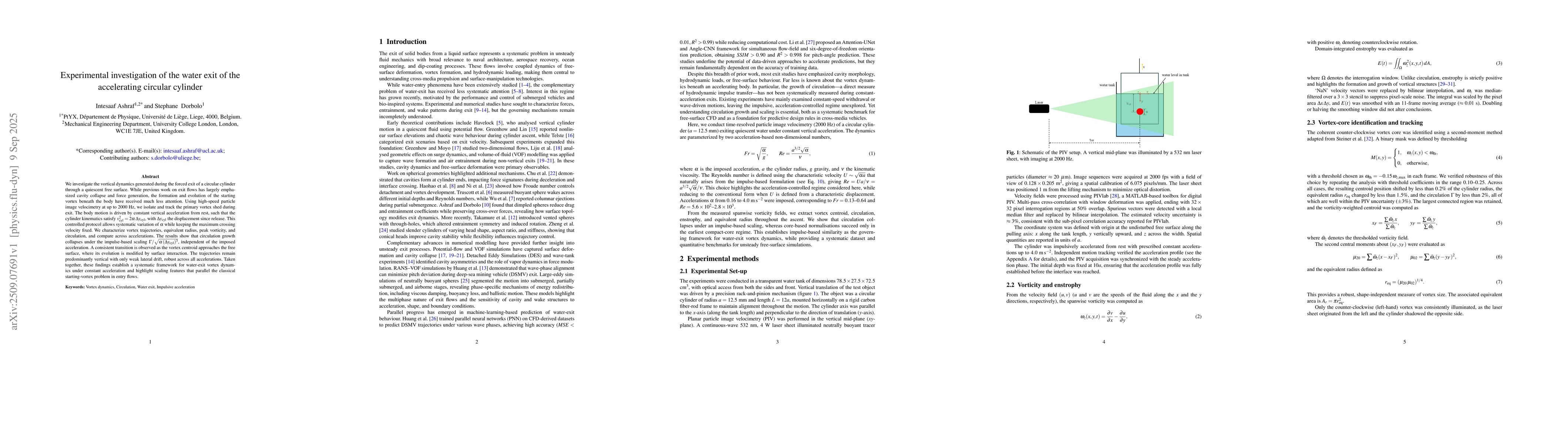 We investigate the vortical dynamics generated during the forced exit of a circular cylinder through a quiescent free surface. While previous work on exit flows has largely emphasized cavity collapse and force generation, the formation and evolution of the starting vortex beneath the body have received much less attention. Using high-speed particle image velocimetry at up to 2000 Hz, we isolate and track the primary vortex shed during exit. The body motion is driven by constant vertical acceleration from rest, such that the cylinder kinematics satisfy $v_{cyl}^2$ = $2$$\alpha$$\Delta$$y_{cyl}$, with $\Delta$ $y_{cyl}$ the displacement since release. This controlled protocol allows systematic variation of the acceleration alpha while keeping the maximum crossing velocity fixed. We characterize vortex trajectories, equivalent radius, peak vorticity, and circulation, and compare across accelerations. The results show that circulation growth collapses under the impulse-based scaling $\Gamma / \sqrt(\alpha(\Delta y_{cyl})^3)$, independent of the imposed acceleration. A consistent transition is observed as the vortex centroid approaches the free surface, where its evolution is modified by surface interaction. The trajectories remain predominantly vertical with only weak lateral drift, robust across all accelerations. Taken together, these findings establish a systematic framework for water-exit vortex dynamics under constant acceleration and highlight scaling features that parallel the classical starting-vortex problem in entry flows.