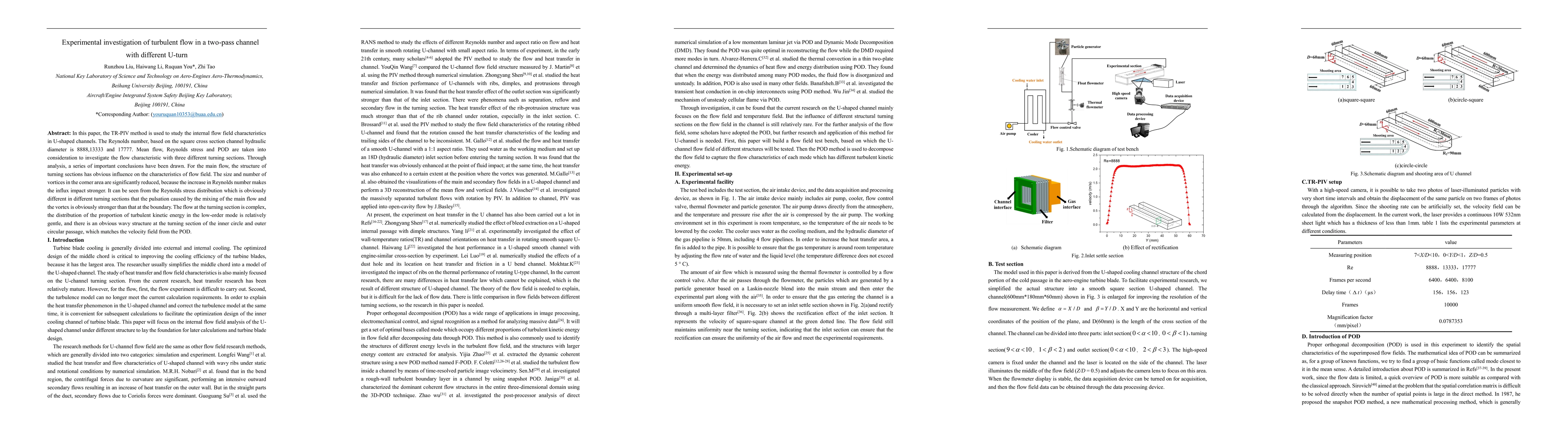 In this paper, the TR-PIV method is used to study the internal flow field characteristics in U-shaped channels. The Reynolds number, based on the square cross section channel hydraulic diameter is 8888,13333 and 17777. Mean flow, Reynolds stress and POD are taken into consideration to investigate the flow characteristic with three different turning sections. Through analysis, a series of important conclusions have been drawn. For the main flow, the structure of turning sections has obvious influence on the characteristics of flow field. The size and number of vortices in the corner area are significantly reduced, because the increase in Reynolds number makes the influx impact stronger. It can be seen from the Reynolds stress distribution which is obviously different in different turning sections that the pulsation caused by the mixing of the main flow and the vortex is obviously stronger than that at the boundary. The flow at the turning section is complex, the distribution of the proportion of turbulent kinetic energy in the low-order mode is relatively gentle, and there is an obvious wavy structure at the turning section of the inner circle and outer circular passage, which matches the velocity field from the POD.