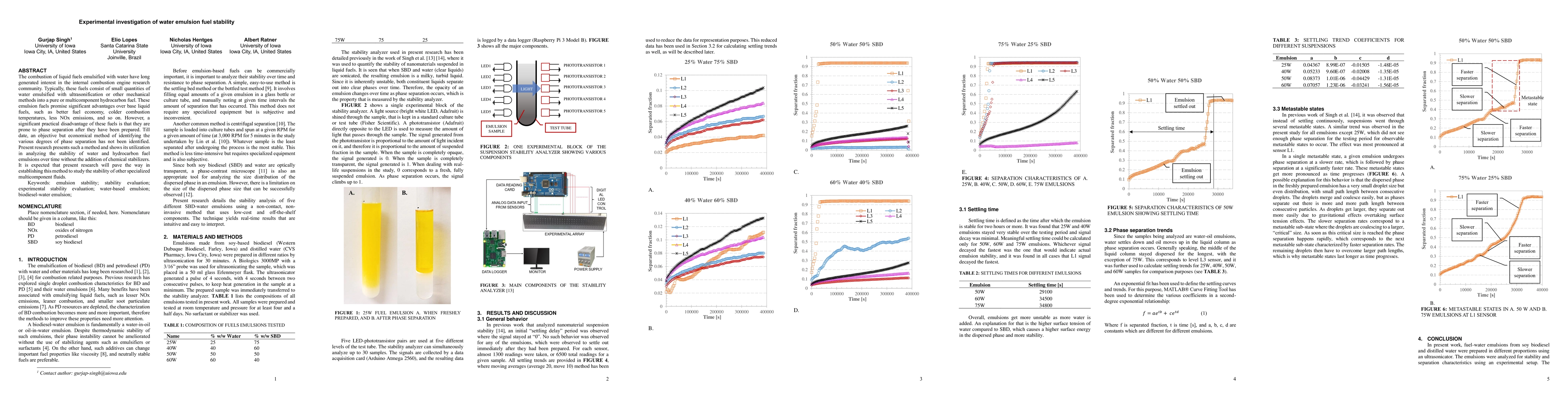 The combustion of liquid fuels emulsified with water have long generated interest in the internal combustion engine research community. Typically, these fuels consist of small quantities of water emulsified with ultrasonification or other mechanical methods into a pure or multicomponent hydrocarbon fuel. These emulsion fuels promise significant advantages over base liquid fuels, such as better fuel economy, colder combustion temperatures, less NOx emissions, and so on. However, a significant practical disadvantage of these fuels is that they are prone to phase separation after they have been prepared. Till date, an objective but economical method of identifying the various degrees of phase separation has not been identified. Present research presents such a method and shows its utilization in analyzing the stability of water and hydrocarbon fuel emulsions over time without the addition of chemical stabilizers. It is expected that present research will pave the way in establishing this method to study the stability of other specialized multicomponent fluids.
