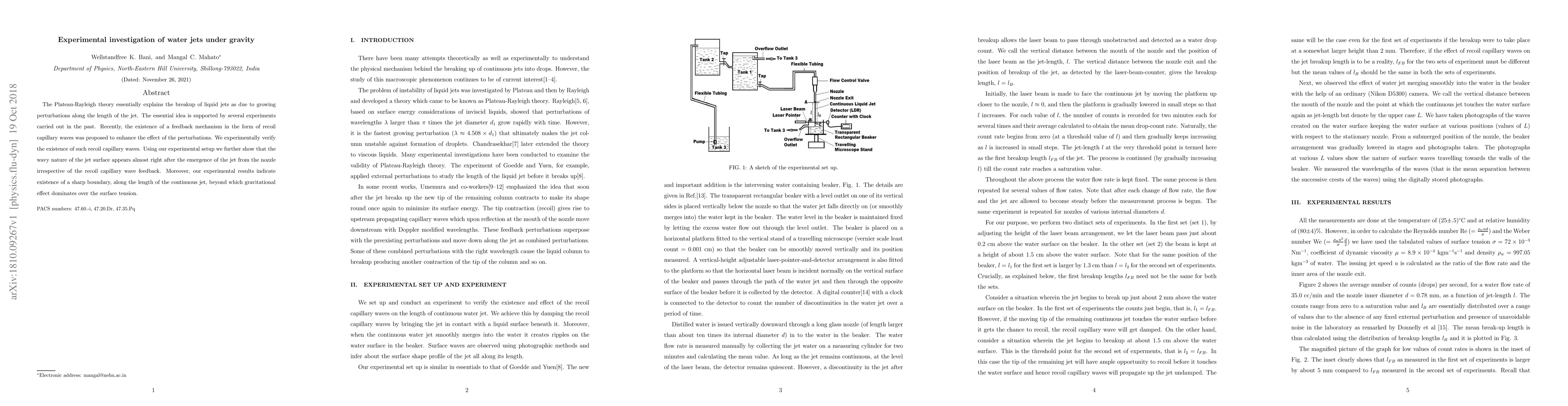The Plateau-Rayleigh theory essentially explains the breakup of liquid jets as due to growing perturbations along the length of the jet. The essential idea is supported by several experiments carried out in the past. Recently, the existence of a feedback mechanism in the form of recoil capillary waves was proposed to enhance the effect of the perturbations. We experimentally verify the existence of such recoil capillary waves. Using our experimental setup we further show that the wavy nature of the jet surface appears almost right after the emergence of the jet from the nozzle irrespective of the recoil capillary wave feedback. Moreover, our experimental results indicate existence of a sharp boundary, along the length of the continuous jet, beyond which gravitational effect dominates over the surface tension.