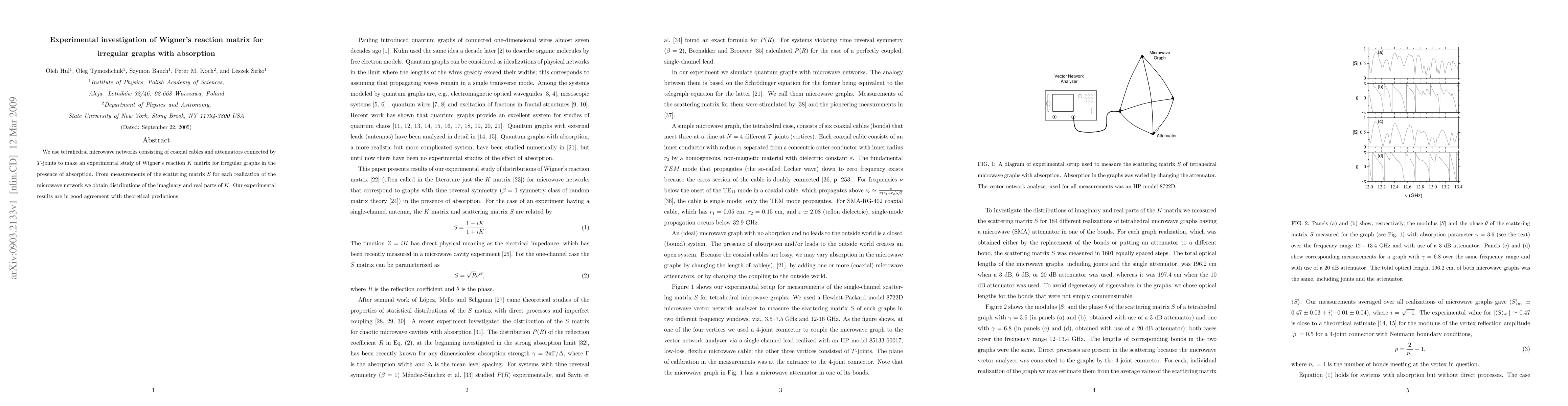 This paper experimentally investigates Wigner's reaction matrix K for irregular graphs using tetrahedral microwave networks, demonstrating agreement between measured scattering matrix distributions and theoretical predictions in the presence of absorption.