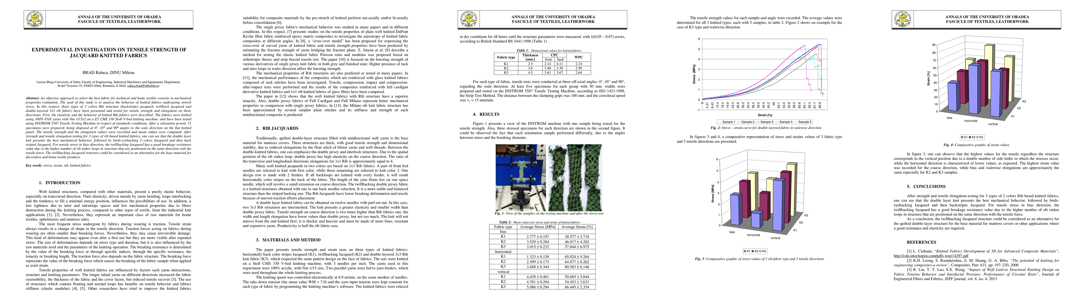 This study investigates the tensile strength and elongation of three types of rib structure Jacquard knitted fabrics: backstripes jacquard, twillback jacquard, and double-layered 3x3 rib fabric. The double-layered knit exhibited the best mechanical performance, followed by twillback jacquard, which showed good resistance in the bias direction due to its rib structure.