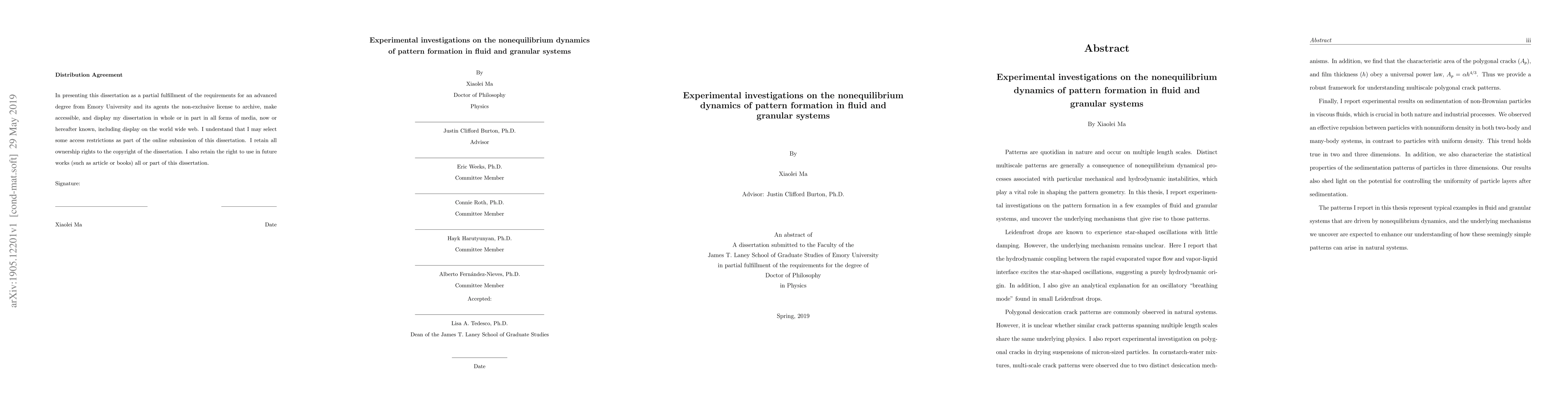 This research investigates the nonequilibrium dynamics behind pattern formation in fluid and granular systems, uncovering mechanisms through experiments on Leidenfrost drops, polygonal desiccation cracks, and sedimentation of non-Brownian particles. It reveals hydrodynamic coupling in drop oscillations, multi-scale crack formation in cornstarch mixtures, and effective repulsion in particle sedimentation.