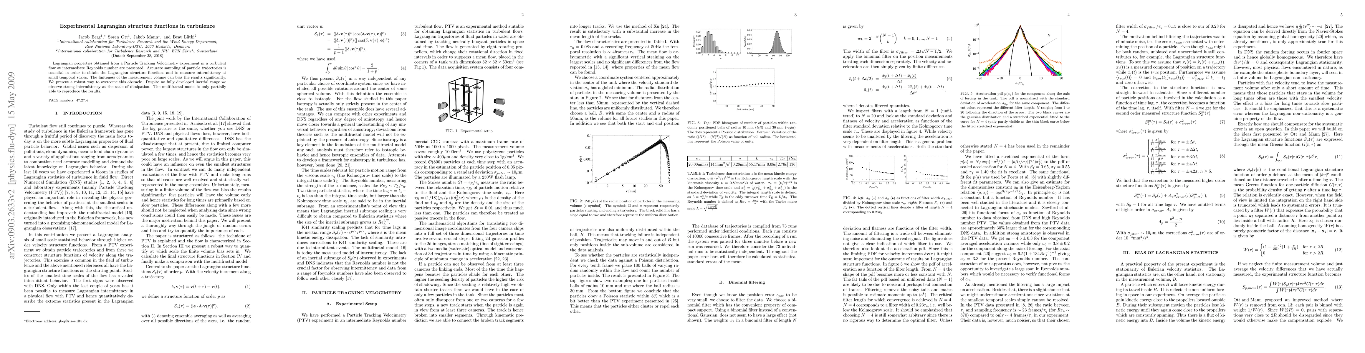 This paper presents Lagrangian properties from a Particle Tracking Velocimetry experiment in turbulent flow, emphasizing the importance of accurate particle trajectory sampling to measure intermittency. The study introduces a method to mitigate biases from finite measurement volumes, observing strong intermittency at dissipation scales despite the absence of a fully developed inertial range, with the multifractal model only partially capturing the results.