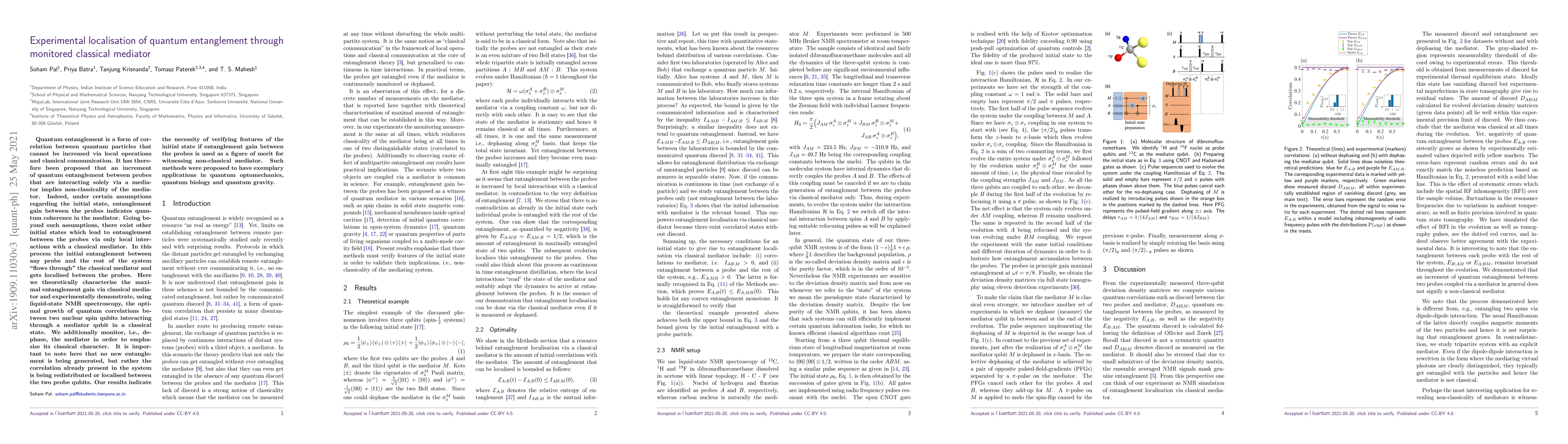 This paper theoretically and experimentally investigates the localization of quantum entanglement through a classical mediator, demonstrating maximal entanglement gain using liquid-state NMR spectroscopy. The study emphasizes the classical nature of the mediator by monitoring it, highlighting the importance of initial state verification in assessing non-classicality in quantum systems.