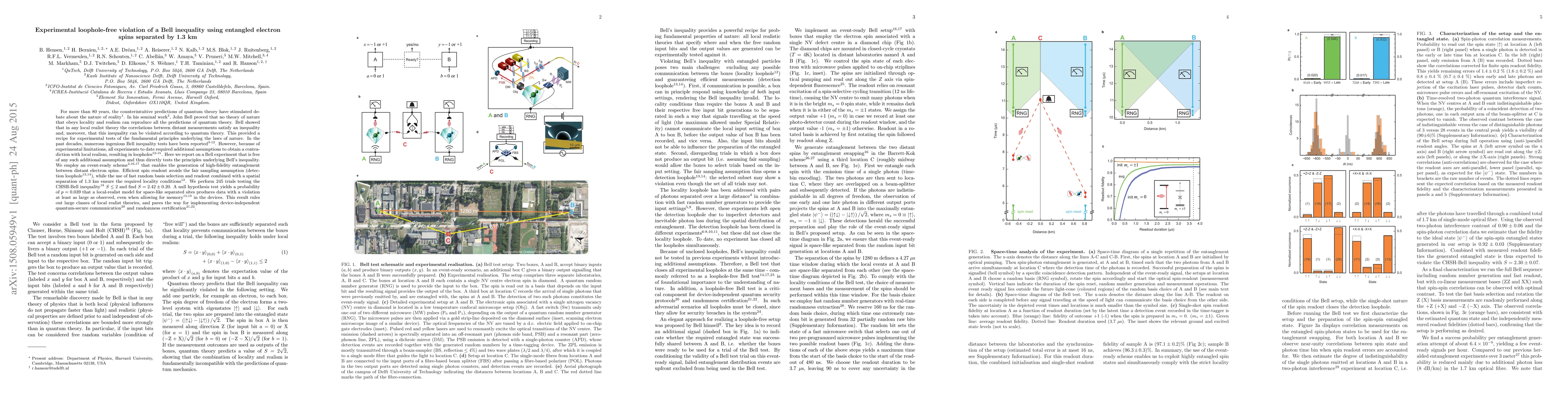 This paper reports a loophole-free Bell test using entangled electron spins separated by 1.3 km, achieving a violation of the CHSH-Bell inequality with $S = 2.42 \pm 0.20$. The experiment rules out local-realist theories with a probability of $p = 0.039$, supporting quantum mechanics and paving the way for quantum communication security.