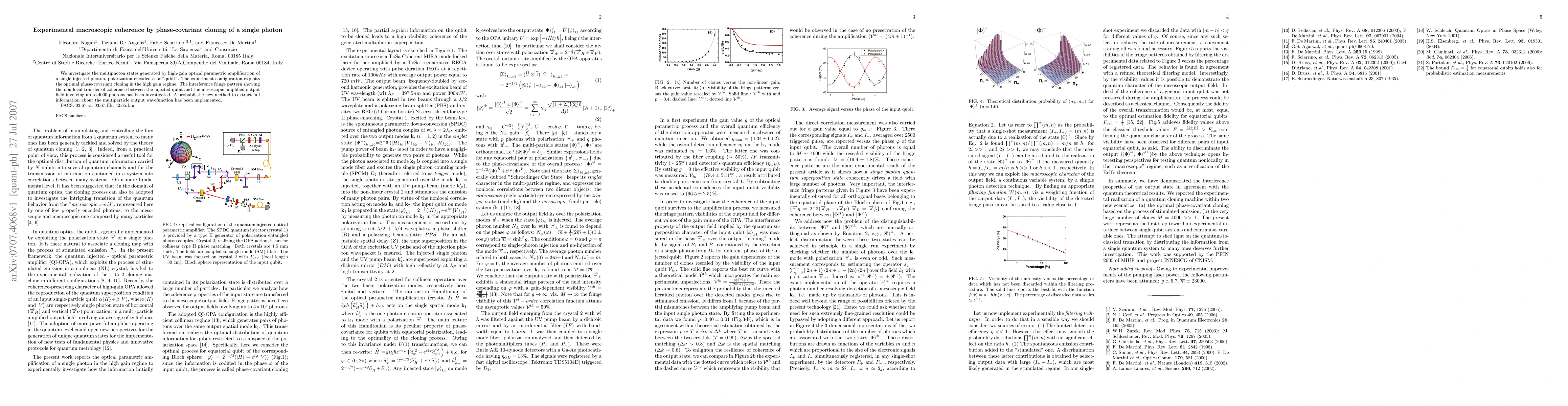 This paper explores high-gain optical parametric amplification to generate multiphoton states from a single injected photon, demonstrating phase-covariant cloning. The experiment reveals non-local coherence transfer through interference fringes and introduces a novel probabilistic method for extracting information from the amplified multiparticle output.