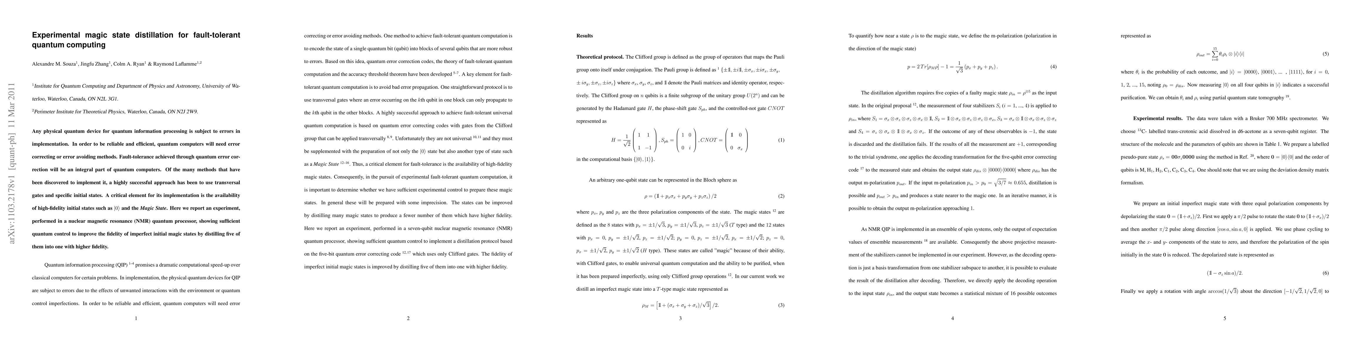 Any physical quantum device for quantum information processing is subject to errors in implementation. In order to be reliable and efficient, quantum computers will need error correcting or error avoiding methods. Fault-tolerance achieved through quantum error correction will be an integral part of quantum computers. Of the many methods that have been discovered to implement it, a highly successful approach has been to use transversal gates and specific initial states. A critical element for its implementation is the availability of high-fidelity initial states such as |0> and the Magic State. Here we report an experiment, performed in a nuclear magnetic resonance (NMR) quantum processor, showing sufficient quantum control to improve the fidelity of imperfect initial magic states by distilling five of them into one with higher fidelity.