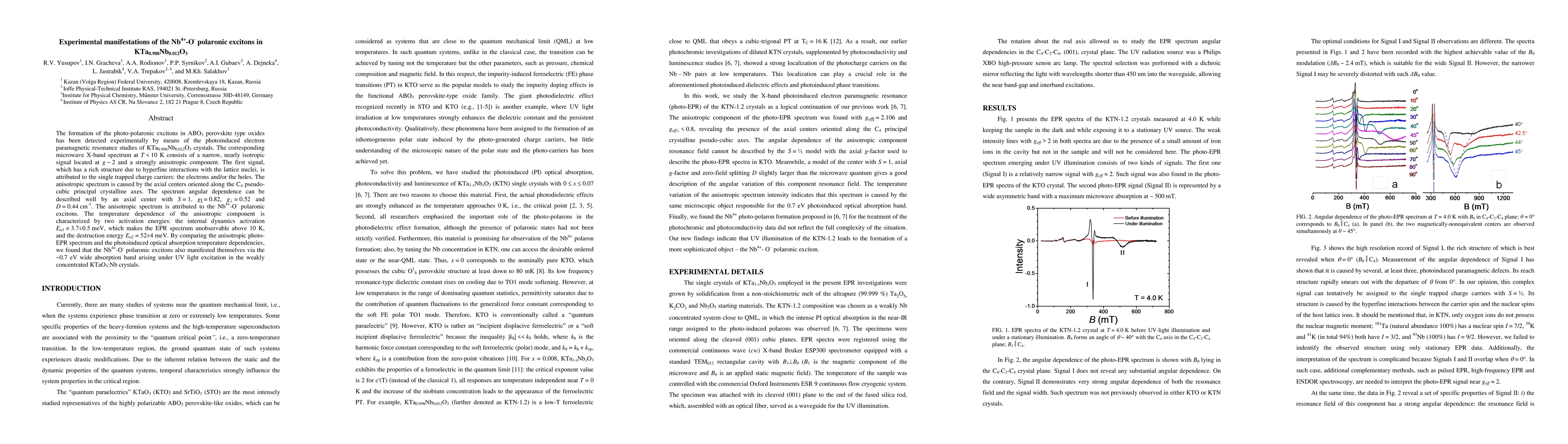 The formation of the photo-polaronic excitons in ABO_{3} perovskite type oxides has been detected experimentally by means of the photoinduced electron paramagnetic resonance studies of KTa_{0.998}Nb_{0.012}O_{3} crystals. The corresponding microwave X-band spectrum at T < 10 K consists of a narrow, nearly isotropic signal located at g ~ 2 and a strongly anisotropic component. The first signal, which has a rich structure due to hyperfine interactions with the lattice nuclei, is attributed to the single trapped charge carriers: the electrons and/or the holes. The anisotropic spectrum is caused by the axial centers oriented along the C_{4} pseudo-cubic principal crystalline axes. The spectrum angular dependence can be described well by an axial center with S = 1, g_{\parallel) = 0.82, g_{\perp} = 0.52 and D = 0.44 cm^{-1}. The anisotropic spectrum is attributed to the Nb^{4+}-O^{-} polaronic excitons. The temperature dependence of the anisotropic component is characterized by two activation energies: the internal dynamics activation E_{a1} = 3.7\pm0.5 meV, which makes the EPR spectrum unobservable above 10 K, and the destruction energy E_{a2} = 52\pm4 meV. By comparing the anisotropic photo-EPR spectrum and the photoinduced optical absorption temperature dependencies, we found that the Nb^{4+}-O^{-} polaronic excitons also manifested themselves via the ~0.7 eV wide absorption band arising under UV light excitation in the weakly concentrated KTaO_{3}:Nb crystals.