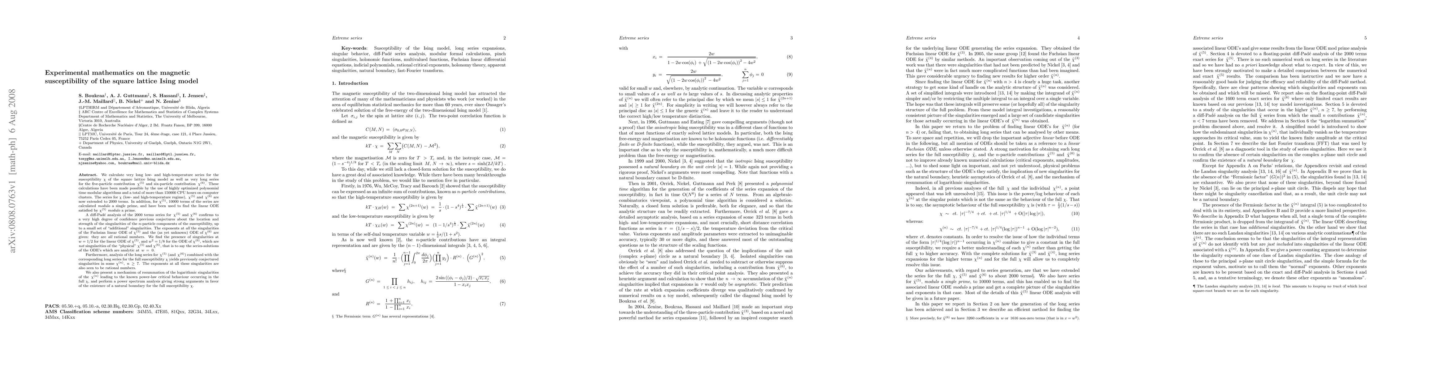This paper presents extensive calculations of the magnetic susceptibility $\chi$ and its higher-order contributions $\chi^{(5)}$ and $\chi^{(6)}$ in the square lattice Ising model using advanced modular algorithms. It confirms previous conjectures about singularities in these contributions, identifies additional singularities, and suggests a natural boundary for the full susceptibility $\chi$.