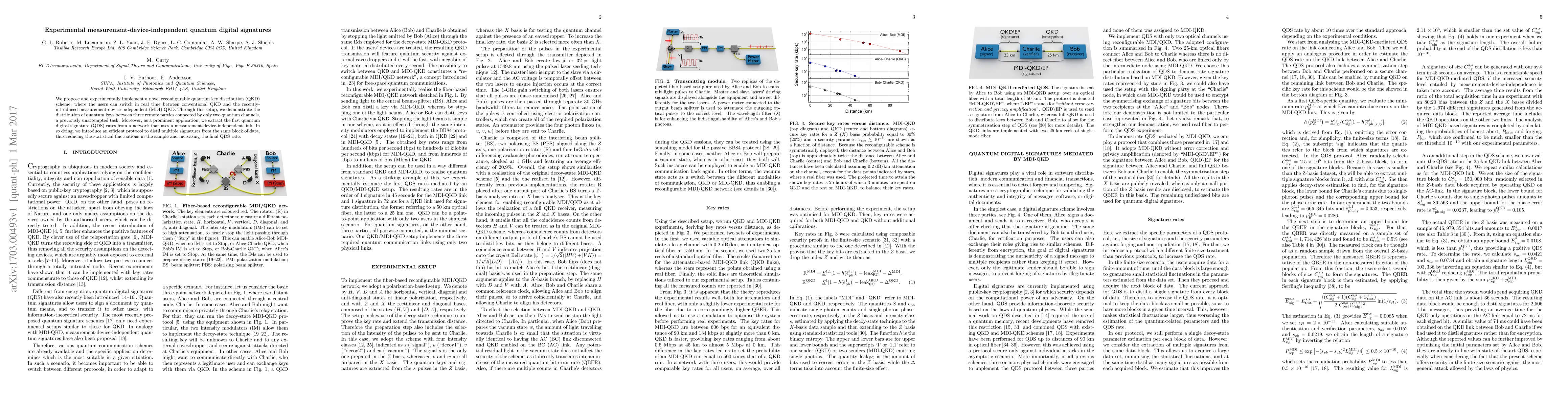 This paper proposes and experimentally implements a reconfigurable quantum key distribution scheme allowing real-time switching between conventional and measurement-device-independent QKD, successfully distributing quantum keys between three remote parties via two quantum channels. It also introduces the first quantum digital signature rates from a network using MDI QKD, with an efficient protocol to distill multiple signatures from the same data block.