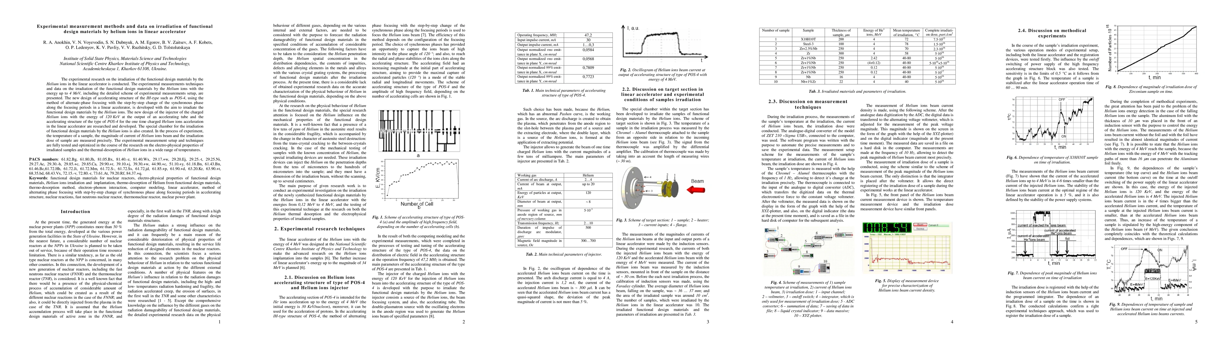 This paper presents experimental methods and data on irradiating functional design materials with helium ions using a linear accelerator. It details the setup, including a new IH-type accelerating structure and injector design, and measures temperature, ion beam current, and irradiation dose to optimize the electro-physical properties study and thermal-desorption analysis.