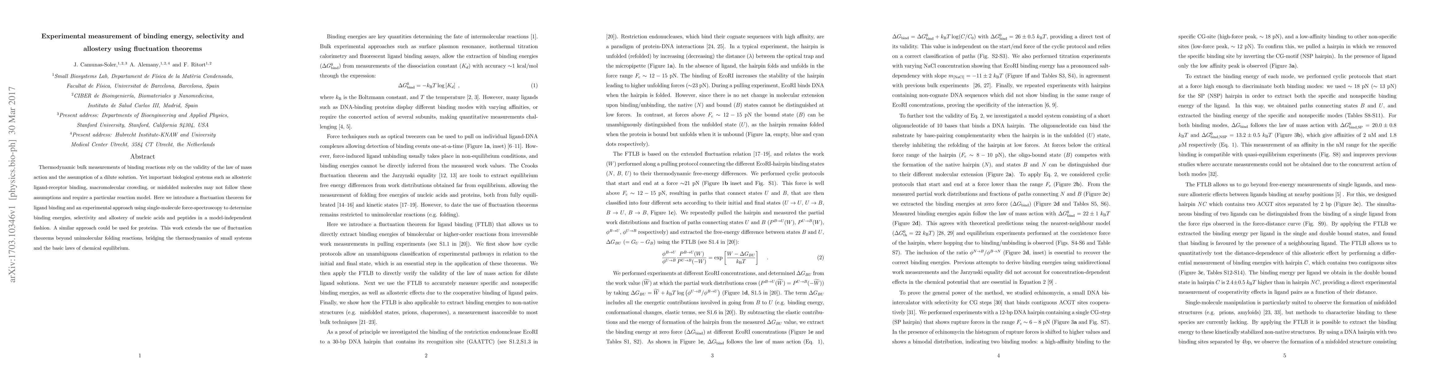 Thermodynamic bulk measurements of binding reactions critically rely on the validity of the law of mass action and the assumption of a dilute solution. Yet important biological systems such as allosteric ligand-receptor binding, macromolecular crowding, or misfolded molecules may not follow this fundamental law and require a particular reaction model. Here we introduce a fluctuation theorem for ligand binding and an experimental approach using single-molecule force-spectroscopy to determine binding energies, selectivity and allostery of nucleic acids, proteins and peptides in a model-independent fashion. This work extends the use of fluctuation theorems beyond unimolecular folding reactions, bridging the thermodynamics of small systems and the basic laws of chemical equilibrium.