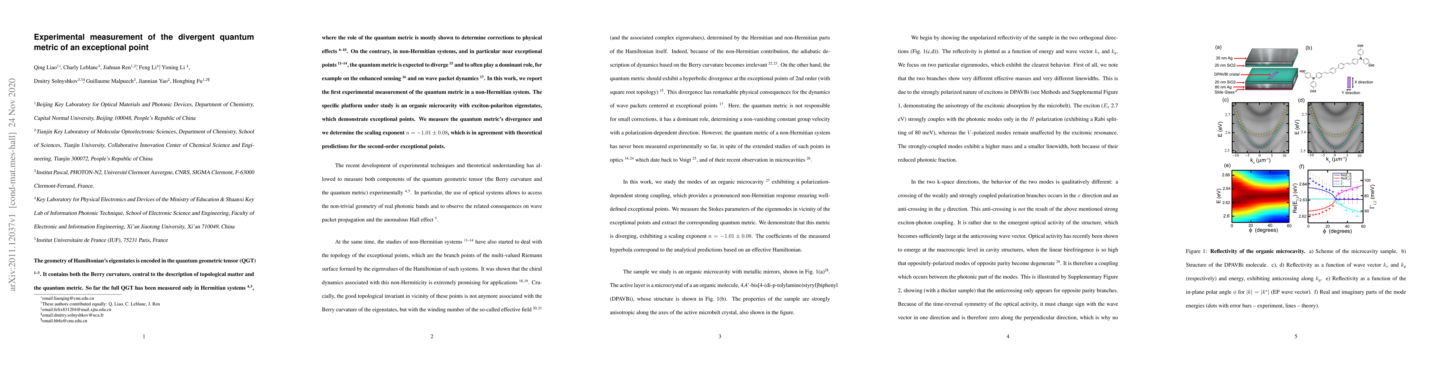 This paper reports the first experimental measurement of the divergent quantum metric in a non-Hermitian system near an exceptional point, using an organic microcavity with exciton-polariton eigenstates. The measured scaling exponent of $n=-1.01\pm0.08$ confirms theoretical predictions for second-order exceptional points.