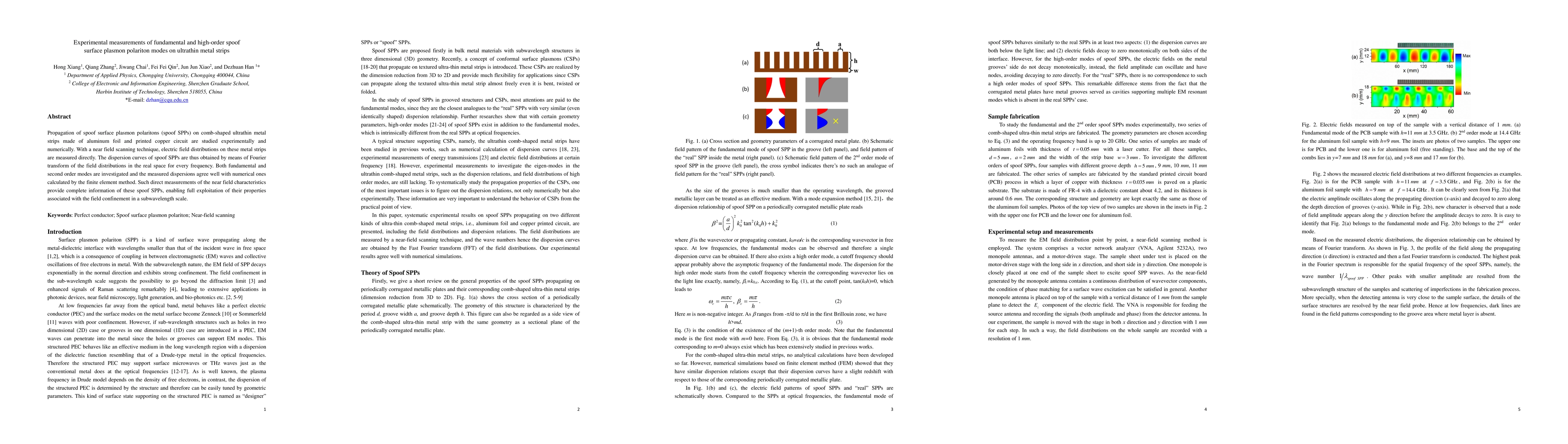 This study experimentally measures fundamental and high-order spoof surface plasmon polariton modes on ultrathin metal strips using near-field scanning techniques. The measured dispersion curves align well with numerical simulations, providing detailed insights into the field confinement characteristics.