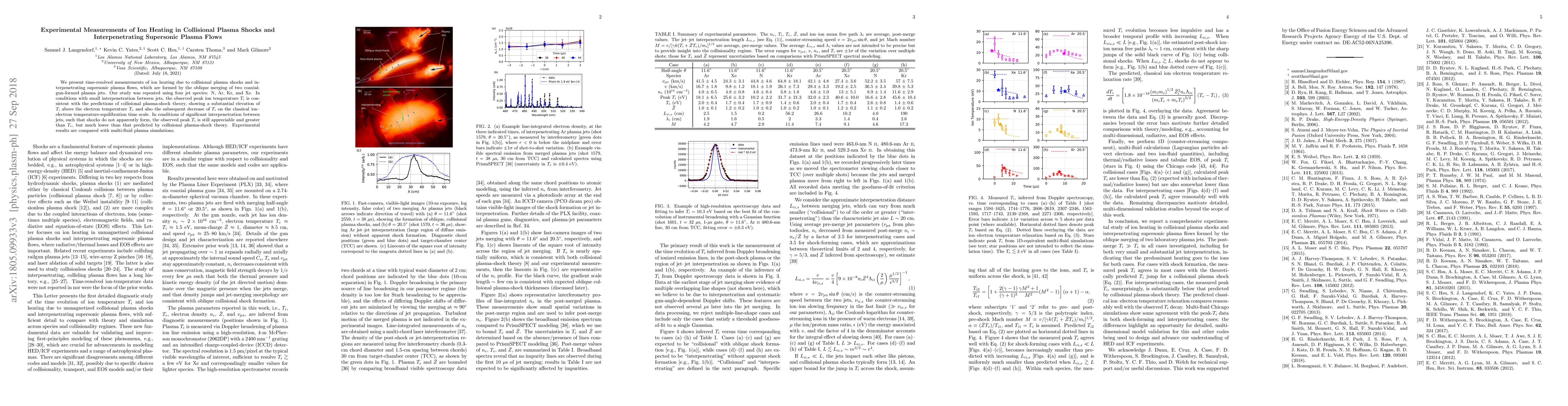 We present time-resolved measurements of ion heating due to collisional plasma shocks and interpenetrating supersonic plasma flows, which are formed by the oblique merging of two coaxial-gun-formed plasma jets. Our study was repeated using four jet species: N, Ar, Kr, and Xe. In conditions with small interpenetration between jets, the observed peak ion temperature Ti is consistent with the predictions of collisional plasma-shock theory, showing a substantial elevation of Ti above the electron temperature Te and also the subsequent decrease of Ti on the classical ion-electron temperature-equilibration time scale. In conditions of significant interpenetration between jets, such that shocks do not apparently form, the observed peak Ti is still appreciable and greater than Te, but much lower than that predicted by collisional plasma-shock theory. Experimental results are compared with multi-fluid plasma simulations.