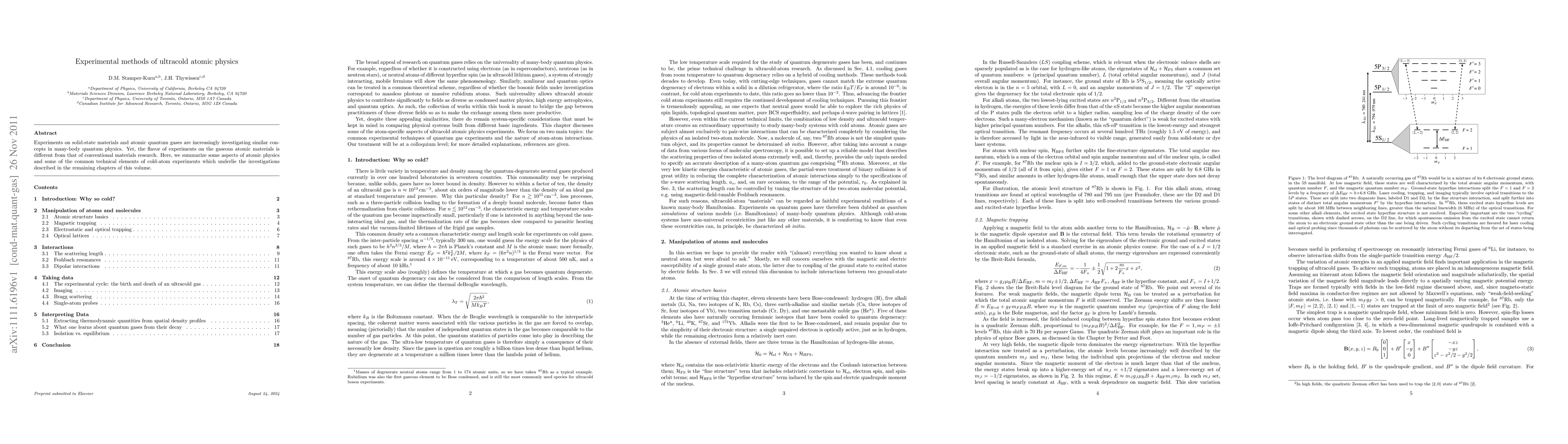 Experiments on solid-state materials and atomic quantum gases are increasingly investigating similar concepts in many-body quantum physics. Yet, the flavor of experiments on the gaseous atomic materials is different from that of conventional materials research. Here, we summarize some aspects of atomic physics and some of the common technical elements of cold-atom experiments which underlie the investigations described in the remaining chapters of this volume.