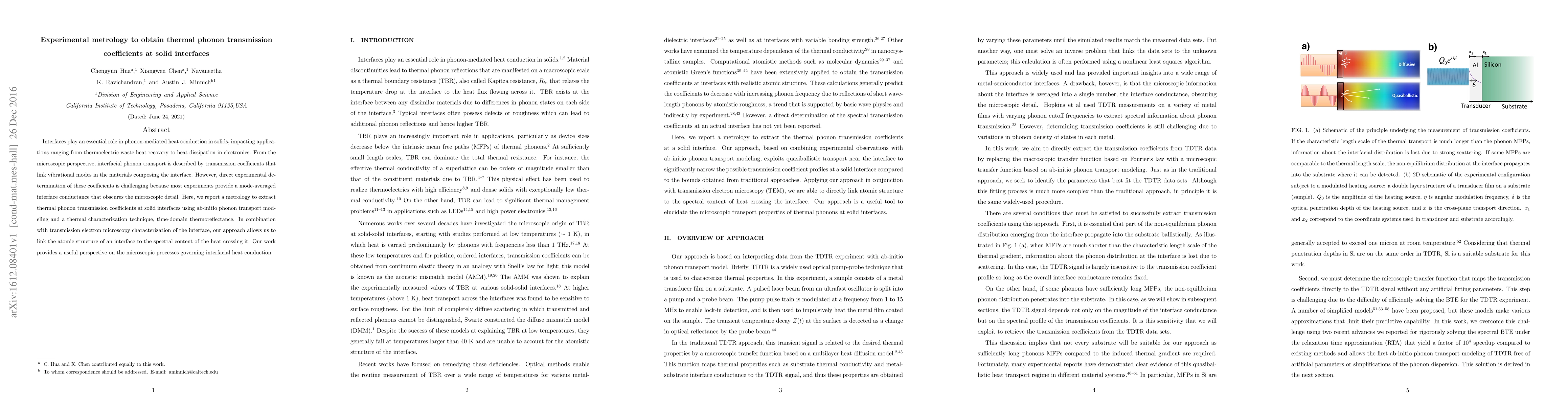 This paper presents a novel experimental metrology combining ab-initio phonon transport modeling and time-domain thermoreflectance to determine thermal phonon transmission coefficients at solid interfaces. The study links the atomic structure of the interface to the spectral content of heat transfer, offering insights into microscopic processes governing interfacial heat conduction.