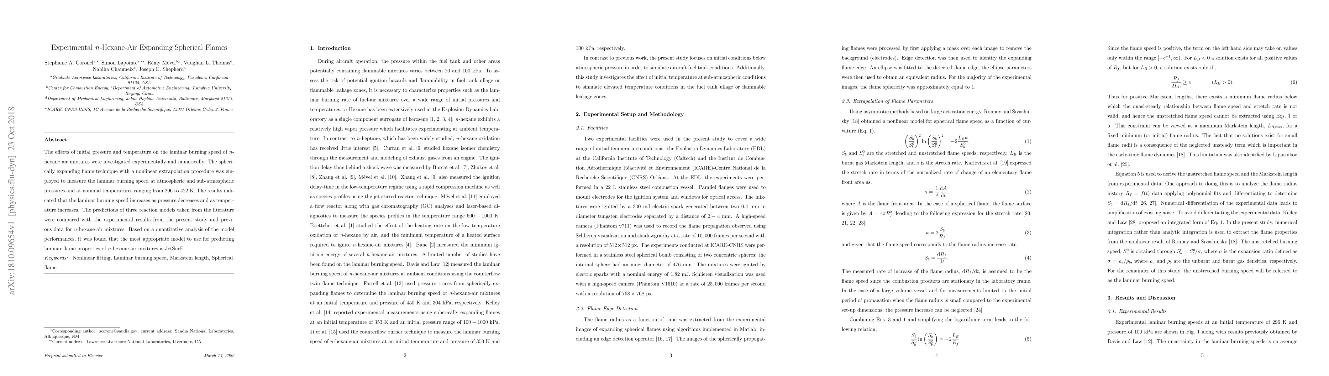 The effects of initial pressure and temperature on the laminar burning speed of n-hexane-air mixtures were investigated experimentally and numerically. The spherically expanding flame technique with a nonlinear extrapolation procedure was employed to measure the laminar burning speed at atmospheric and sub-atmospheric pressures and at nominal temperatures ranging from 296 to 422 K. The results indicated that the laminar burning speed increases as pressure decreases and as temperature increases. The predictions of three reaction models taken from the literature were compared with the experimental results from the present study and previous data for n-hexane-air mixtures. Based on a quantitative analysis of the model performances, it was found that the most appropriate model to use for predicting laminar flame properties of n-hexane-air mixtures is JetSurF.