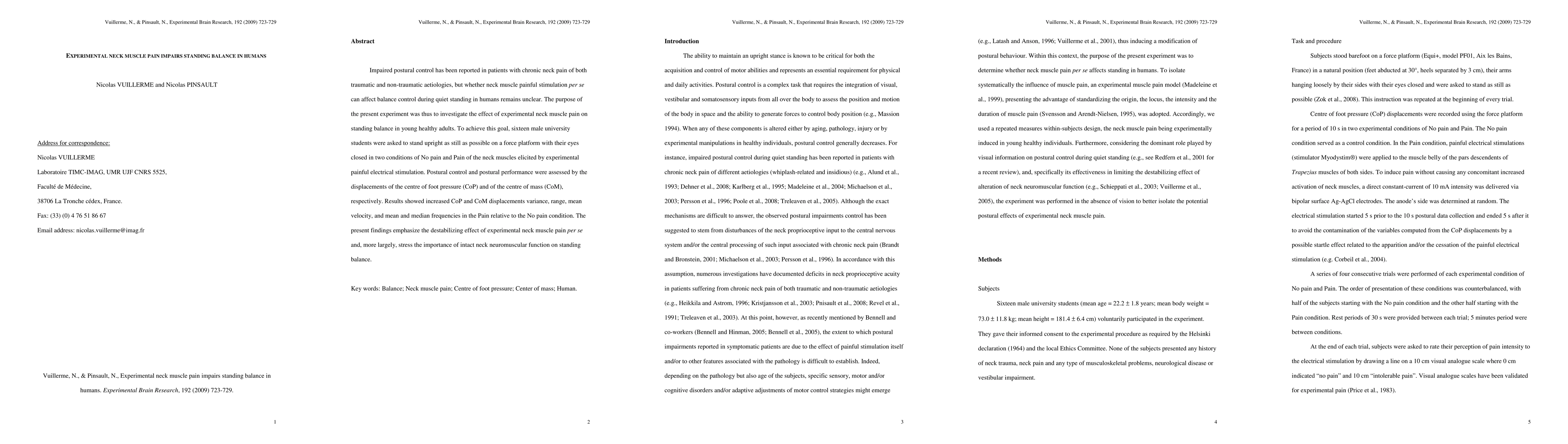 This study found that experimental neck muscle pain, induced by electrical stimulation in healthy adults, significantly impairs standing balance, as evidenced by increased displacements of the center of foot pressure and center of mass. The results highlight the critical role of neck neuromuscular function in maintaining balance.