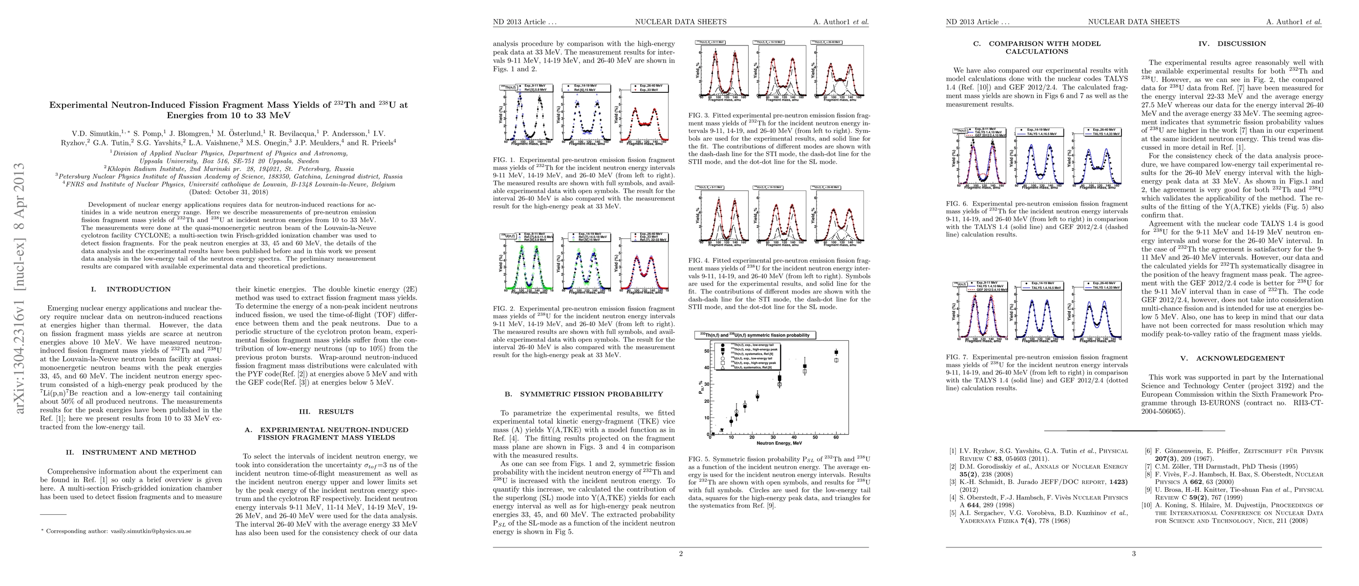 This paper reports experimental measurements of neutron-induced fission fragment mass yields for thorium-232 and uranium-238 at neutron energies from 10 to 33 MeV, using a twin Frisch-gridded ionization chamber at the CYCLONE cyclotron facility. The results are compared with existing experimental data and theoretical predictions to enhance nuclear energy applications.