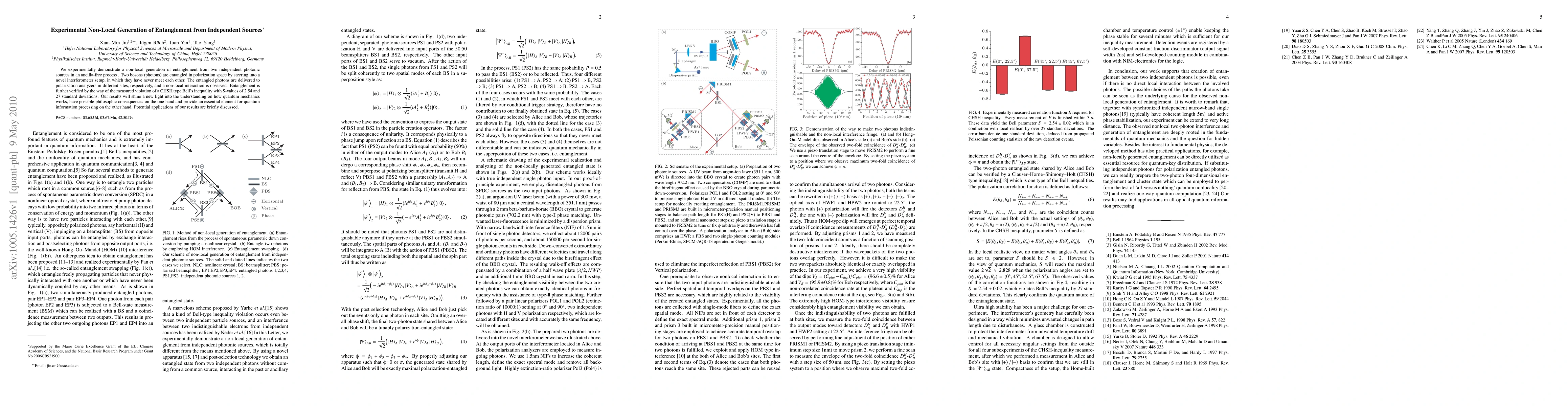 This paper demonstrates a non-local generation of entanglement from two independent photonic sources without using an ancilla. Entangled photons are produced via a novel interferometer setup and verified through a CHSH-type Bell's inequality violation, highlighting potential applications in quantum information processing.