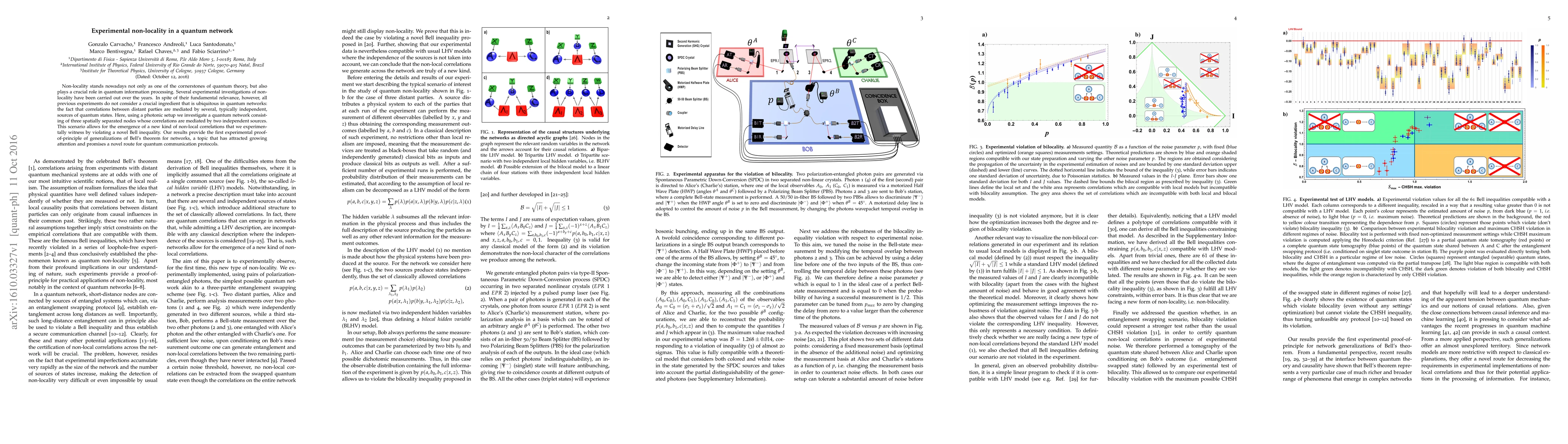 Non-locality stands nowadays not only as one of the cornerstones of quantum theory, but also plays a crucial role in quantum information processing. Several experimental investigations of nonlocality have been carried out over the years. In spite of their fundamental relevance, however, all previous experiments do not consider a crucial ingredient that is ubiquitous in quantum networks: the fact that correlations between distant parties are mediated by several, typically independent, sources of quantum states. Here, using a photonic setup we investigate a quantum network consisting of three spatially separated nodes whose correlations are mediated by two independent sources. This scenario allows for the emergence of a new kind of non-local correlations that we experimentally witness by violating a novel Bell inequality. Our results provide the first experimental proof-of-principle of generalizations of Bell's theorem for networks, a topic that has attracted growing attention and promises a novel route for quantum communication protocols.