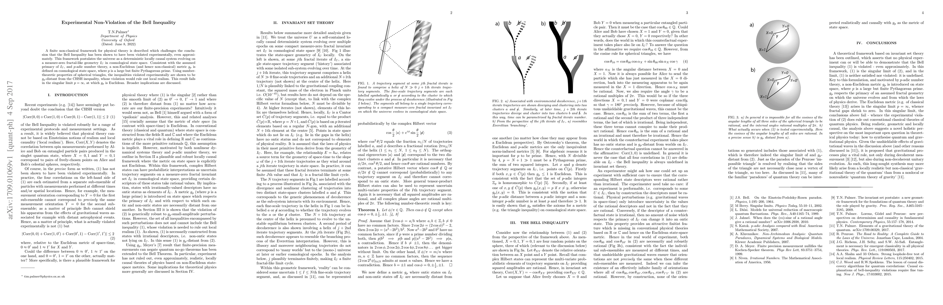 A finite non-classical framework for physical theory is described which challenges the conclusion that the Bell Inequality has been shown to have been violated experimentally, even approximately. This framework postulates the universe as a deterministic locally causal system evolving on a measure-zero fractal-like geometry $I_U$ in cosmological state space. Consistent with the assumed primacy of $I_U$, and $p$-adic number theory, a non-Euclidean (and hence non-classical) metric $g_p$ is defined on cosmological state space, where $p$ is a large but finite Pythagorean prime. Using number-theoretic properties of spherical triangles, the inequalities violated experimentally are shown to be $g_p$-distant from the CHSH inequality, whose violation would rule out local realism. This result fails in the singular limit $p=\infty$, at which $g_p$ is Euclidean. Broader implications are discussed.