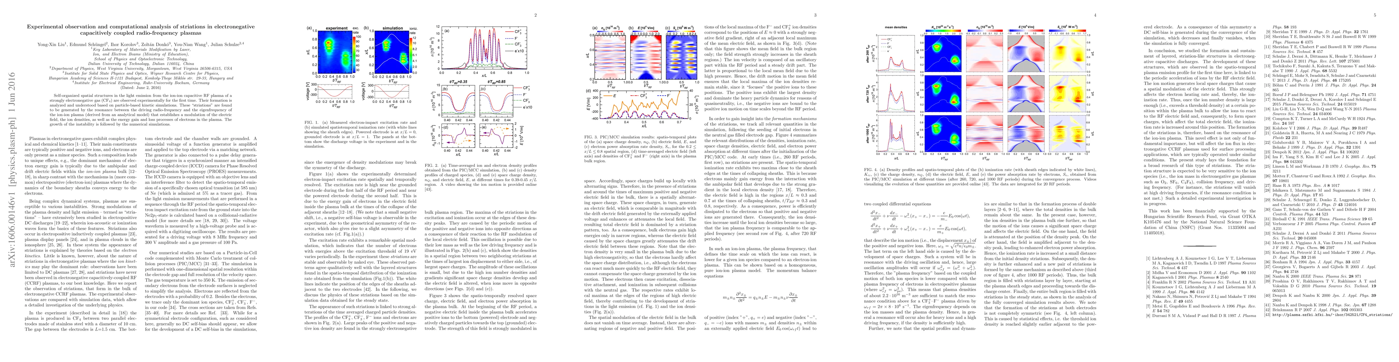 This paper reports the first experimental observation of striations in electronegative capacitively coupled radio-frequency plasmas, revealing self-organized spatial structures in light emission. The formation of these striations is explained through particle-based kinetic simulations, attributing their origin to the resonance between the radio-frequency driving and the eigenfrequency of the ion-ion plasma.