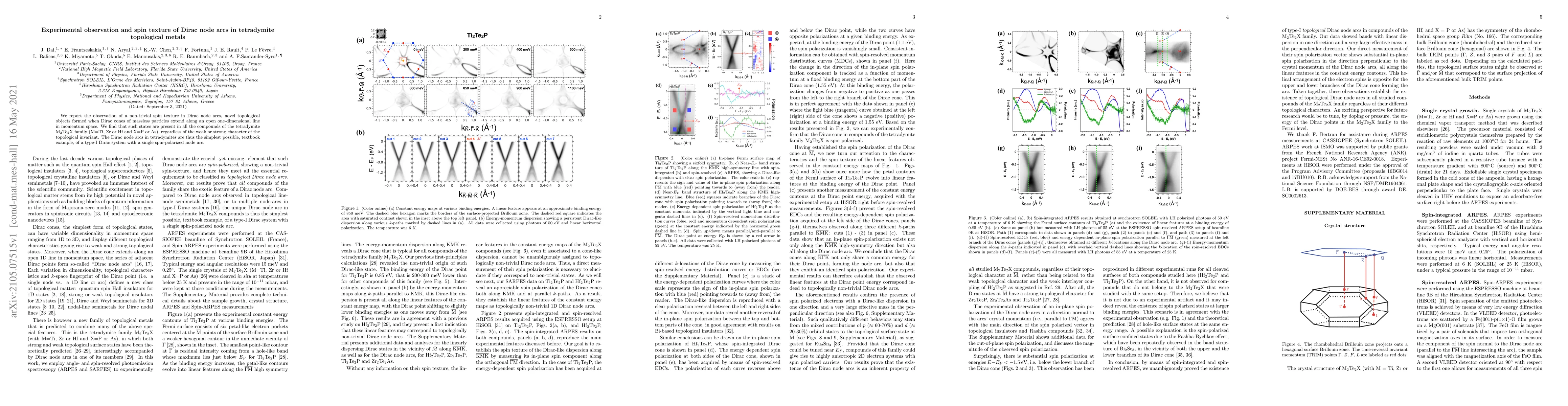 This study reports the discovery of Dirac node arcs in tetradymite topological metals, characterized by a unique spin texture along an open line in momentum space. These arcs exemplify type-I Dirac systems, observed in all M$_2$Te$_2$X compounds (M=$$Ti, Zr, Hf$; X=$$P, As$), regardless of the strength of their topological invariant.